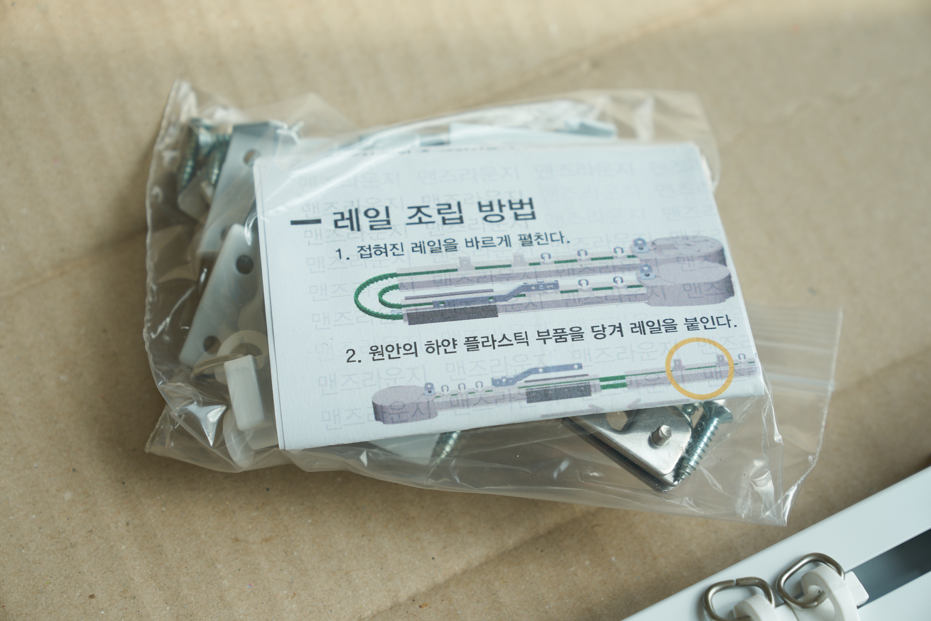 멘즈라운지에서 맞춤형으로 구입하면 각족 부속품이 딸려옵니다. 레일 조립하는 방법이 아주 친절하게 그려져있는 설명서가 포함돼있고, 각종 나사와 부속품들이 부족하지 않게 들어있네요.