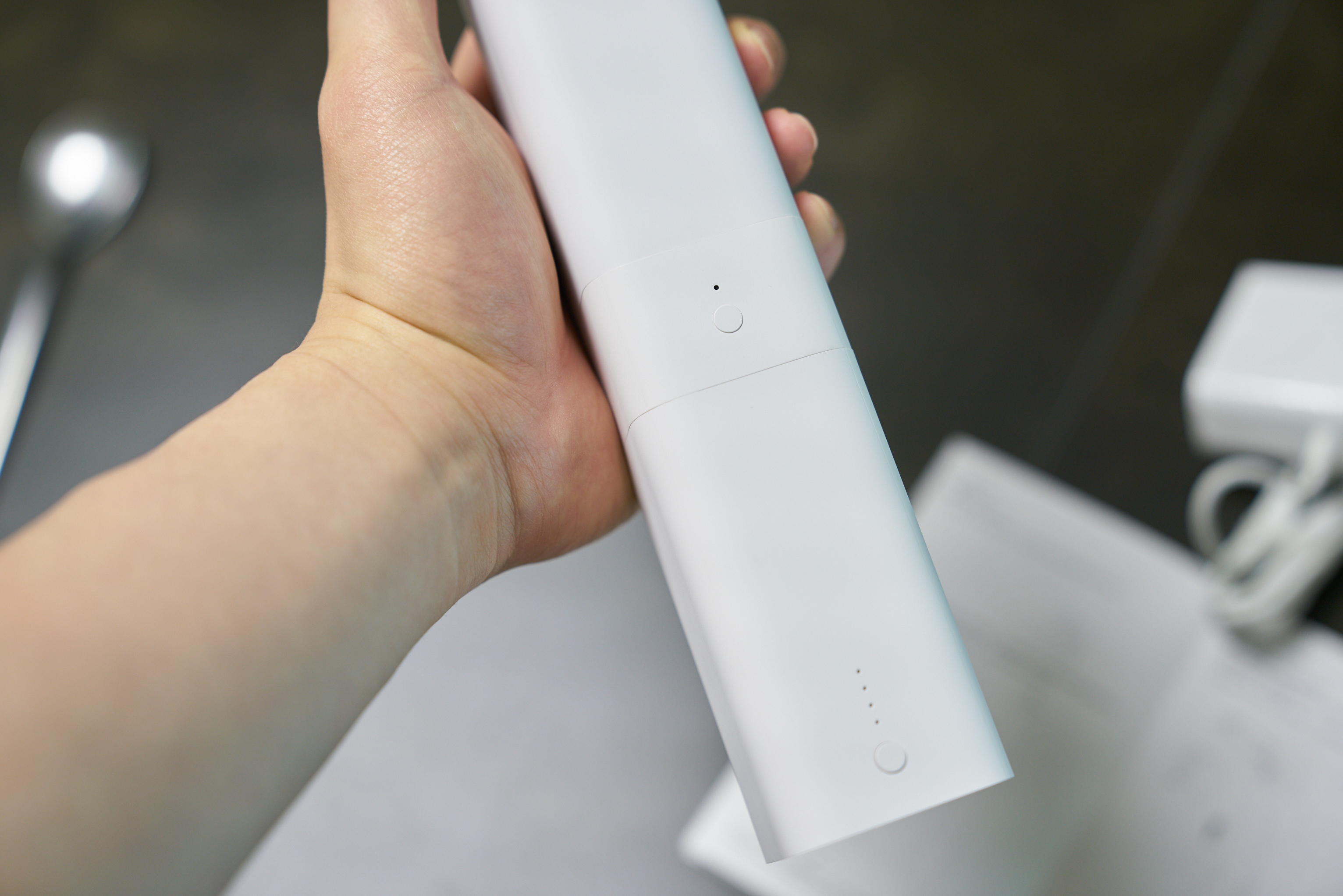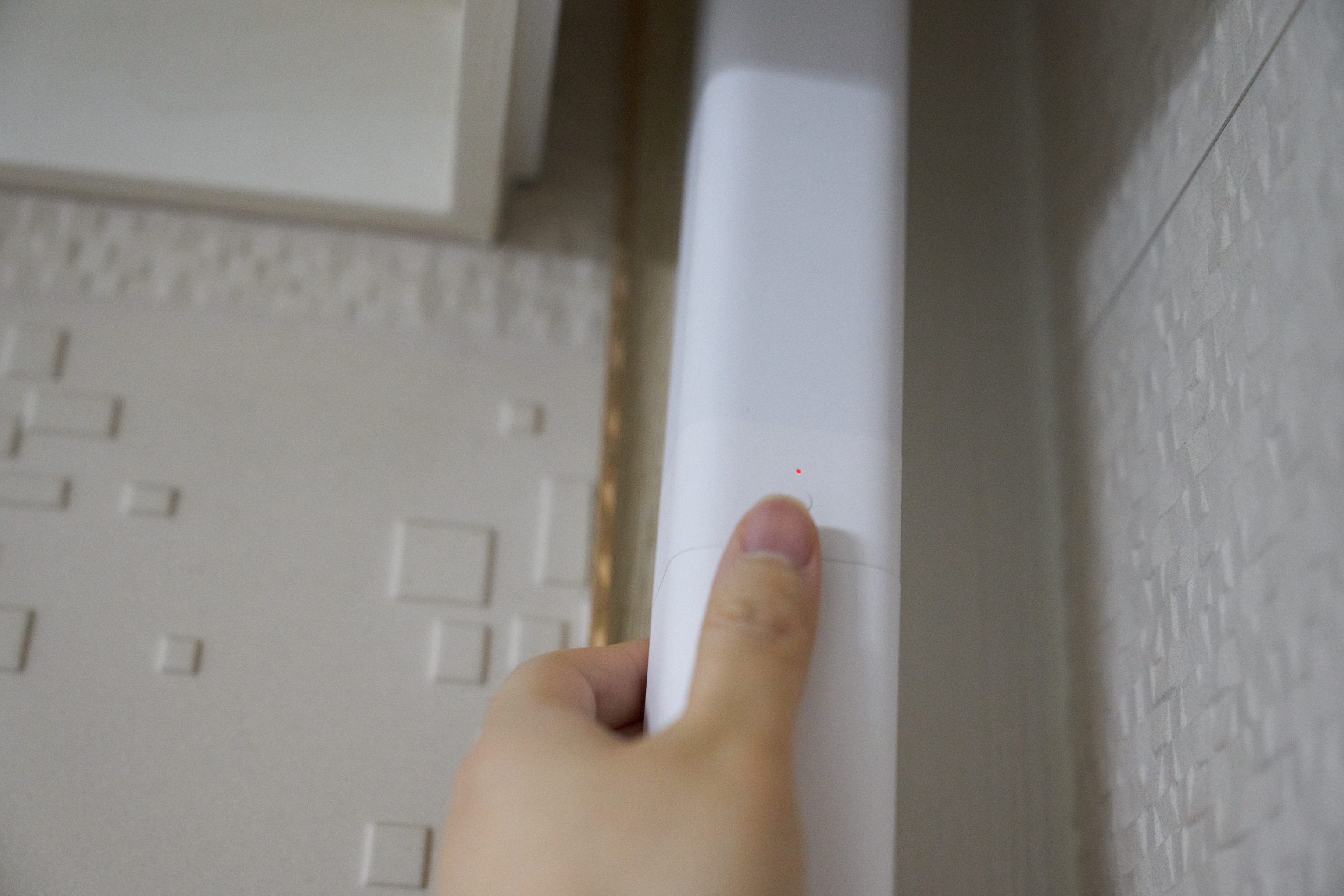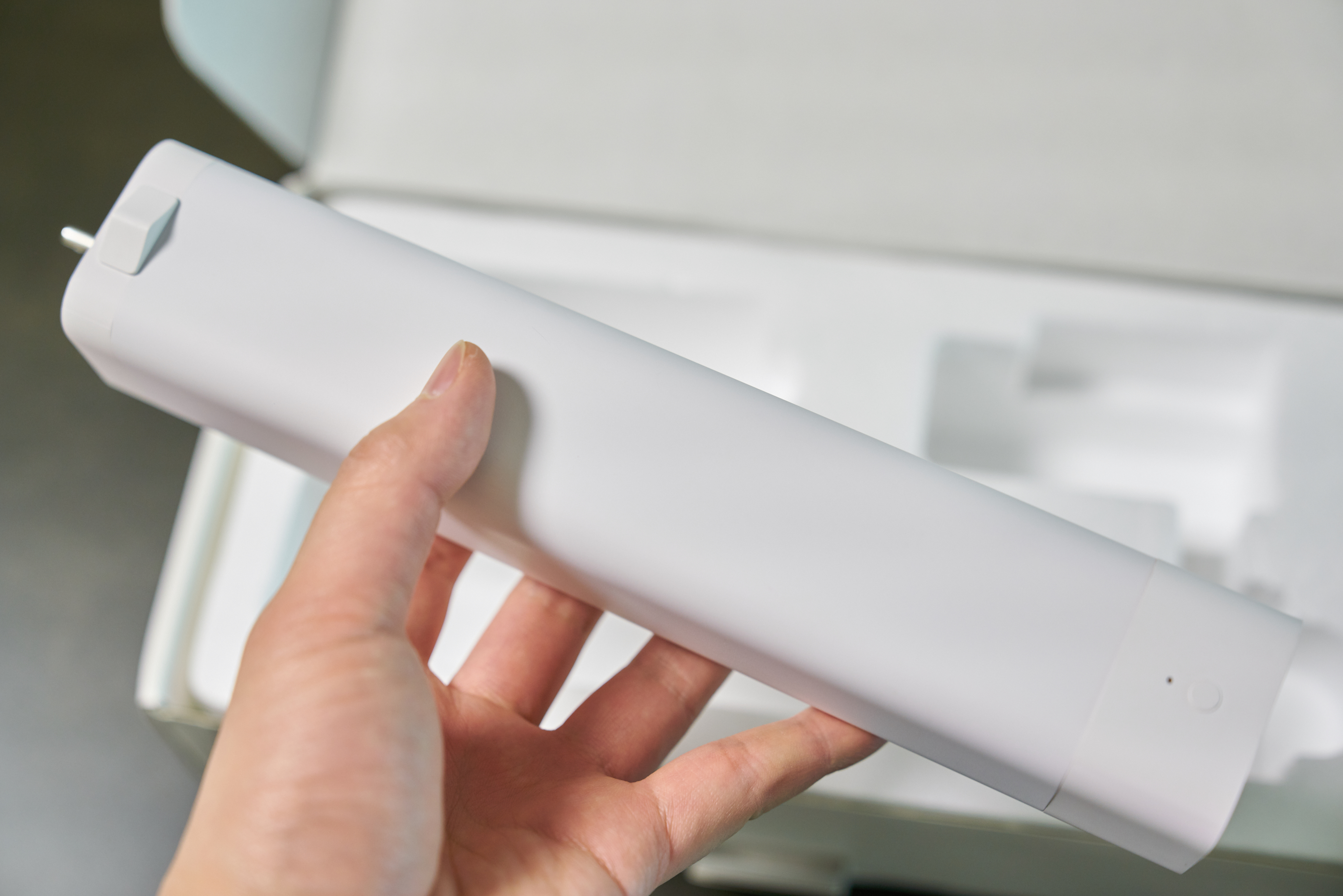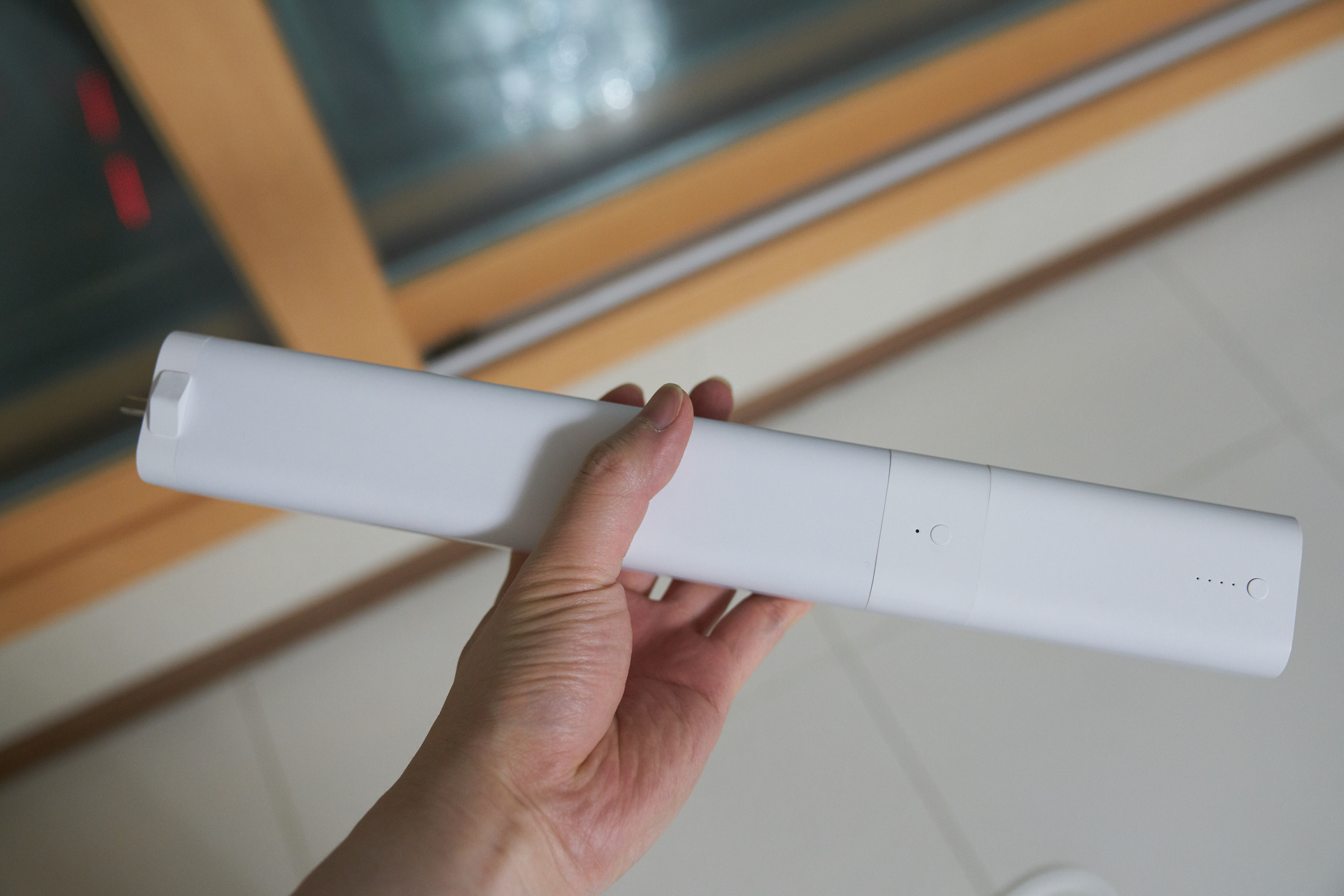 모터 본체와 배터리를 결합하면 아주 깔끔하게 원래 하나였던 것 같은 느낌?이 듭니다. 길이는 모터 끝부분까지 37cm 정도 되고, 생각보다 길이가 많이 긴 것 같습니다. 위의 사진을 보면 버튼이 2개 있는데 위의 버튼은 모터에 있는 버튼으로 페이링할 때? 그리고 수동으로 열고 닫을때? 사용할 수 있고 아래 버튼은 배터리 상태를 확인할 수 있습니다.