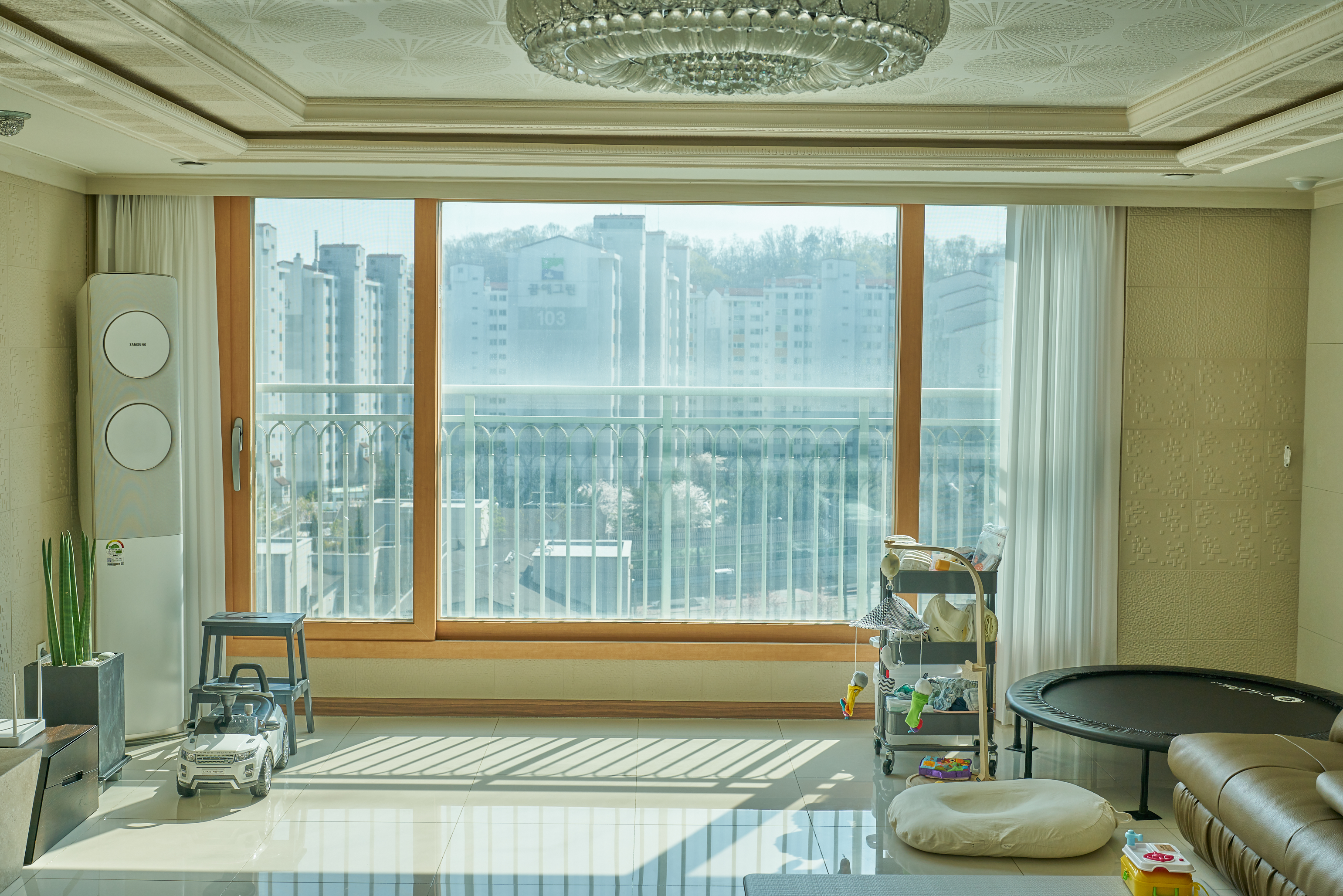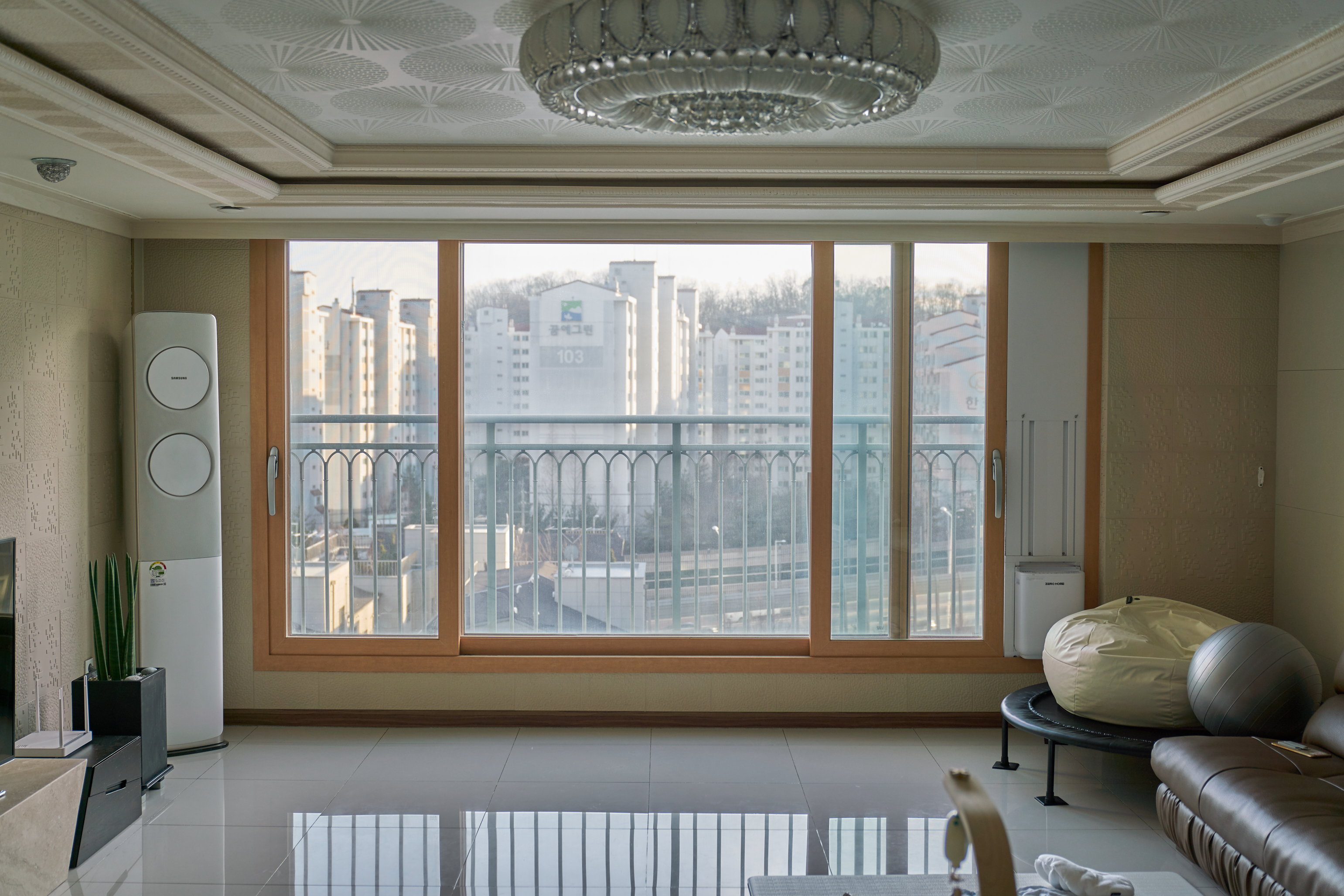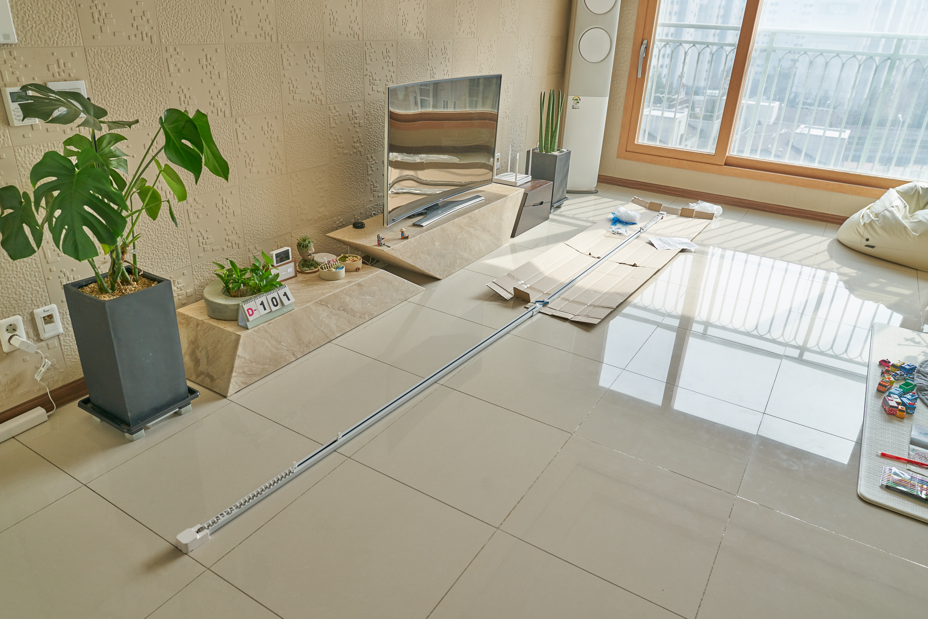 일단 저희 거실입니다. 끝에서 끝까지는 5미터가 넘는 길이지만 오른쪽에 있는 벽 부분 안쪽으로는 커튼 설치가 불가능해서 왼쪽 끝에서 오른쪽 벽 앞까지 설치했습니다.