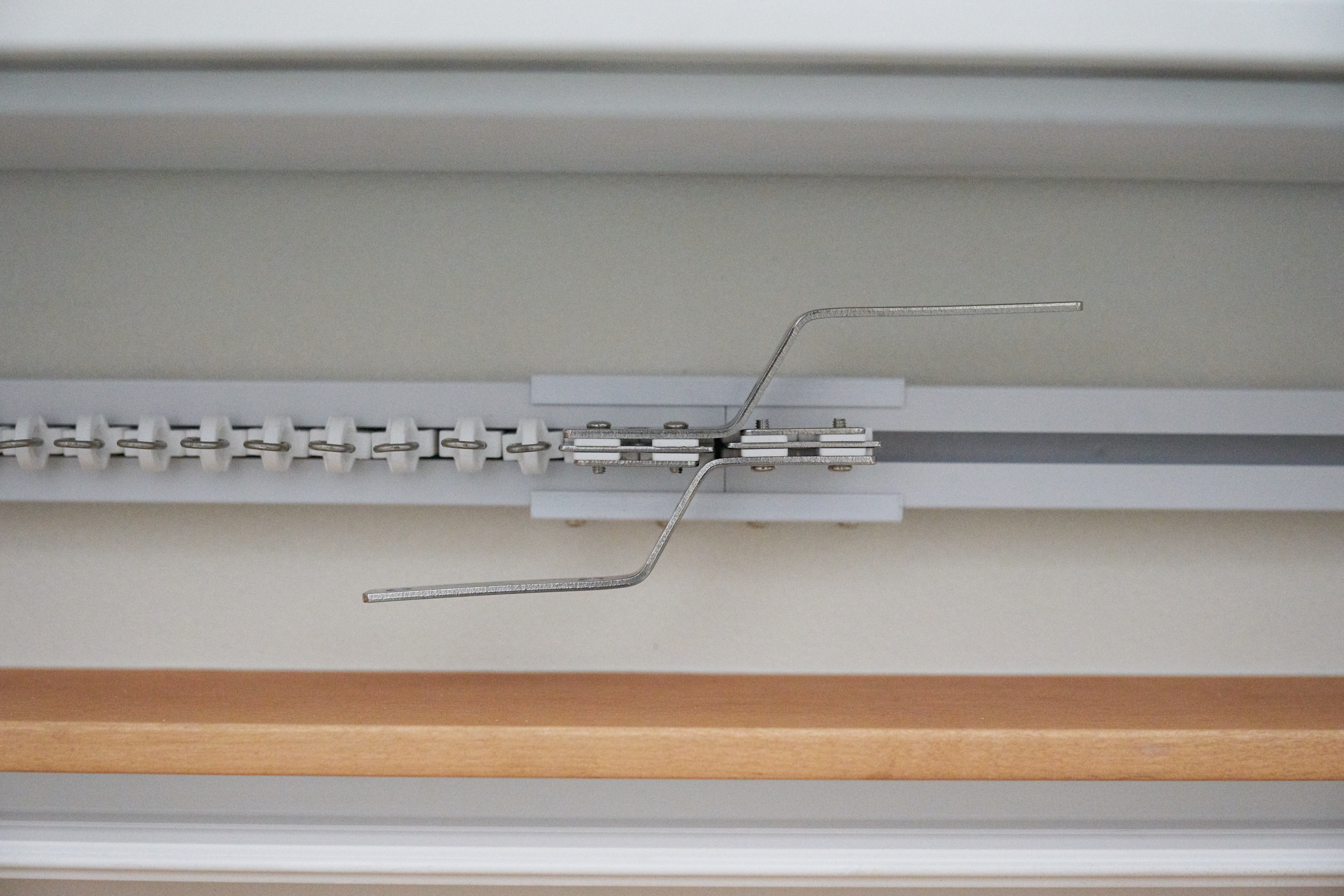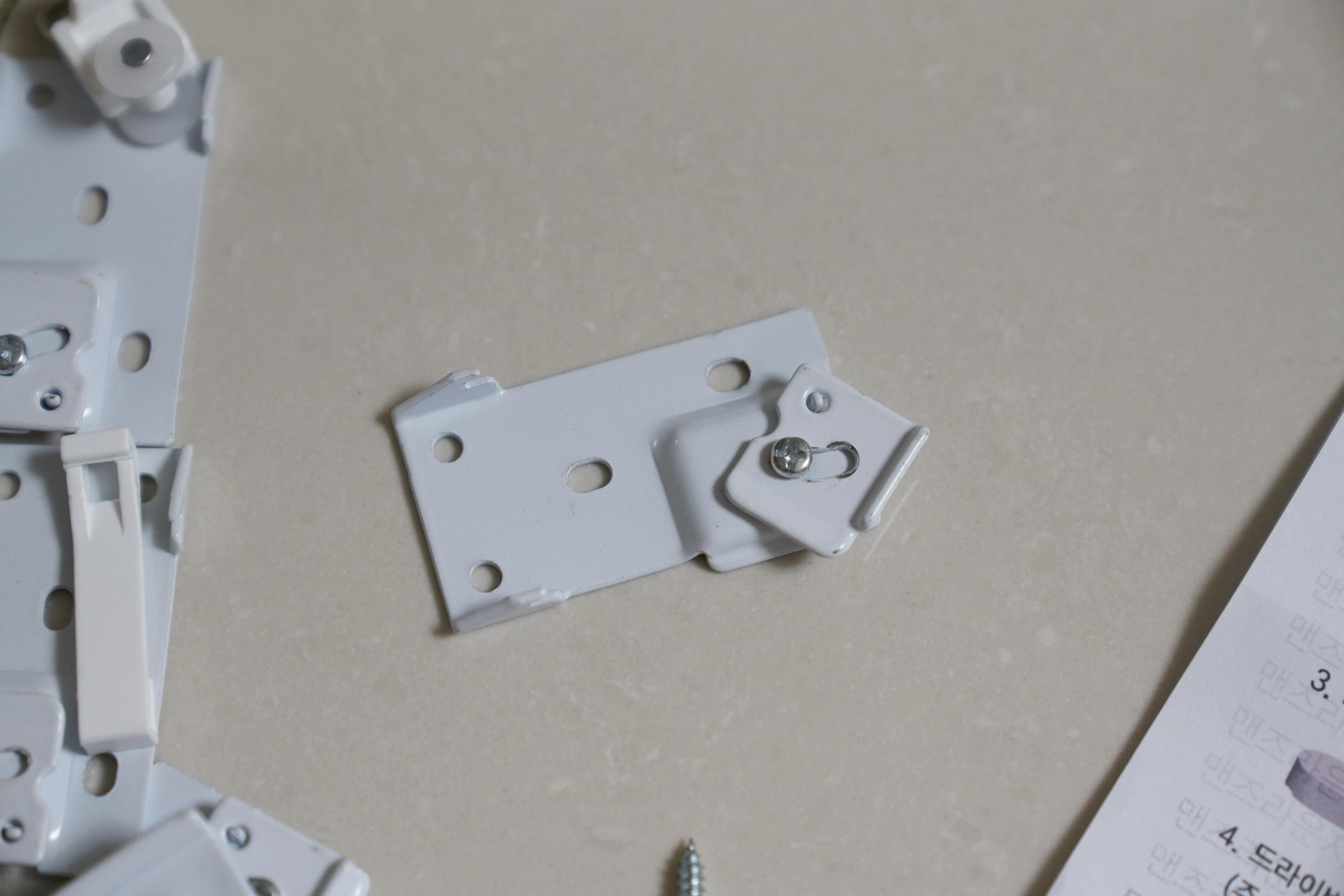 그리고 커튼박스에 레일을 고정하는 부품입니다. 우리나라에서는 커튼레일 안쪽에 나사를 박는 형식이었다면.. 이 녀석은 브라켓이 따로 있어서 레일을 고정하는 방식입니다. 나름의 장점이 있는데.. 레일을 설치할 때 중앙을 맞추지 못하더라도.. 설치한 후 브라켓을 살짝 풀어서 커튼박스에서 중앙을 잡아줄 수도 있고.. 때어냈다가 다시 거는 것도 편합니다.