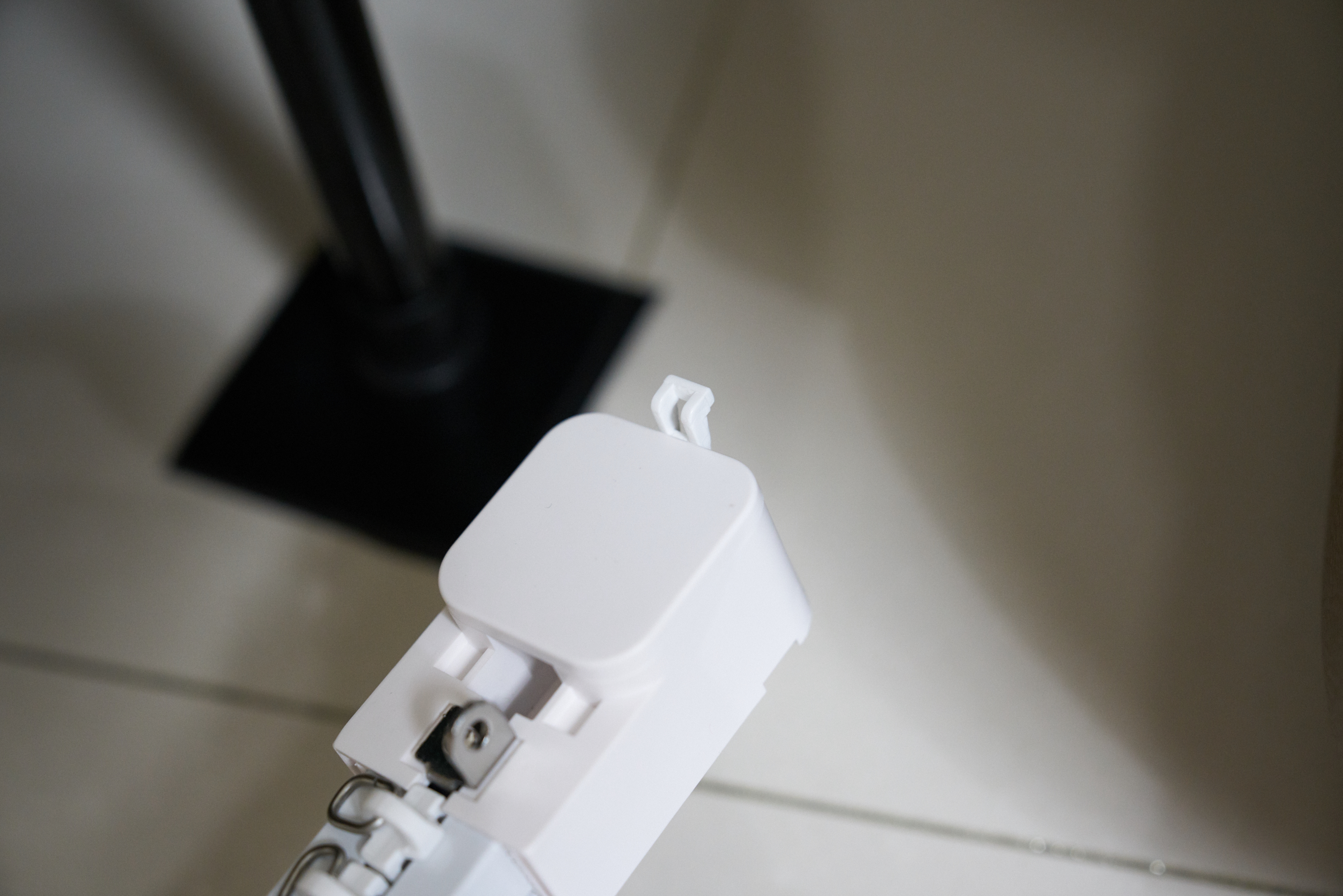 그리고 모터폴리 끝부분을 보면.. 이렇게 고리?가 있는데 이녀석을 미리 꽂아주고 레일을 설치해야합니다. 이 녀석은 사방으로 꽂을 수 있는데.. 사용할 커튼의 주름 폭?에 따라서 살짝 보기 흉할 수도 있습니다. 그래서 시간이 되면 레일을 떼어내고 저 고리를 앞쪽으로 변경할 예정입니다.