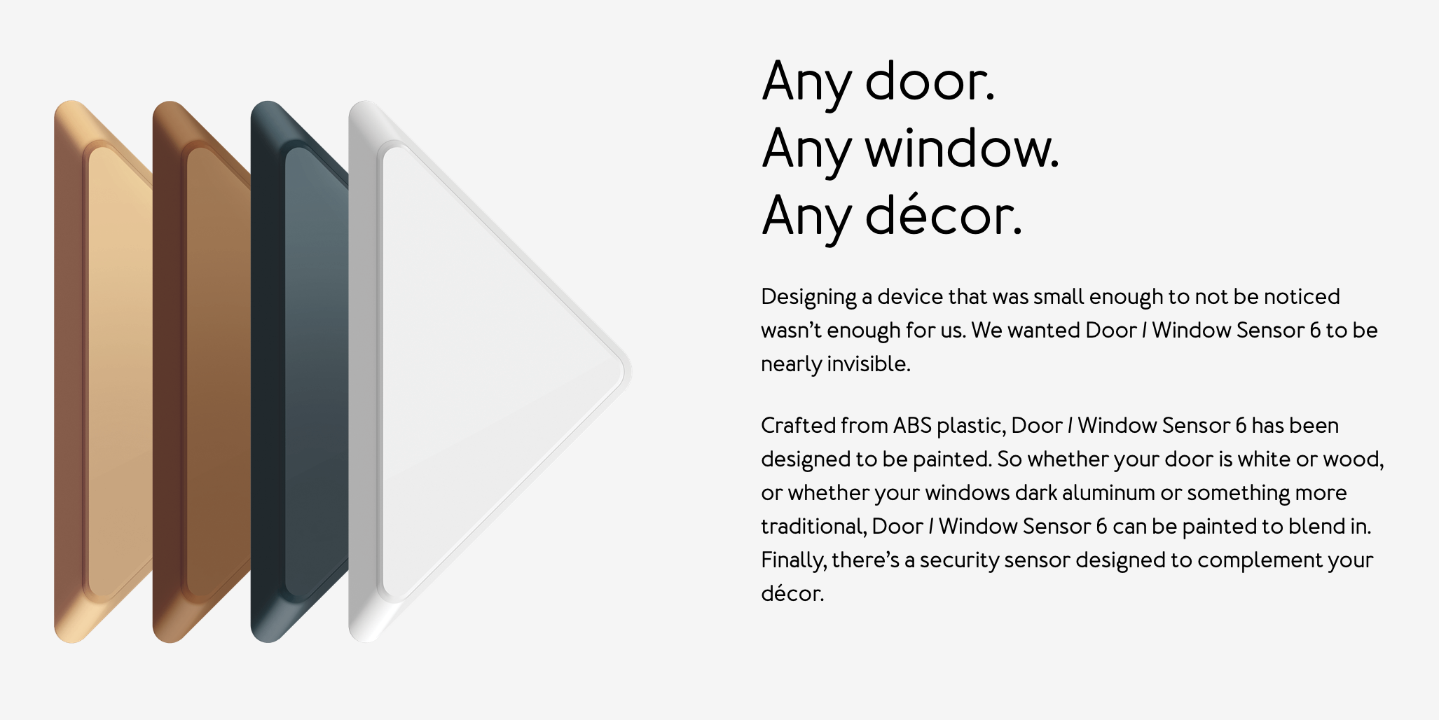 이 도어센서는 특징이 다른 센서와는 다르게 특이한 디자인으로 돼있다는 점입니다. 일단 도어센서를 설치할 때 눈에 보이는 것에 신경을 많이 쓰는 분들이라면 이 센서 눈여겨봐도 될 것 같습니다. 일단 세모 모양으로 만들어져있어서 최대한 구석에 부착할 수 있다는 점도 있지만, 이 제품 케이스 소재 특징이 페인팅을 해도 되는 제품이라고 합니다. 즉.. 부착할 곳의 색상을 센서에 발라서 티가 안나게 사용할 수 있다는 점이겠네요.
