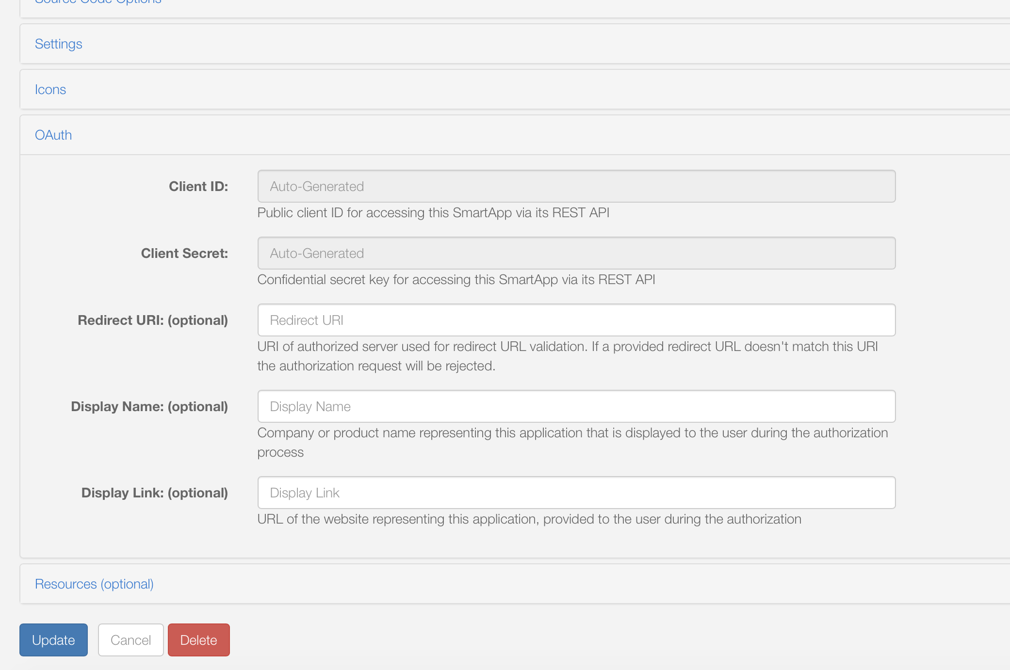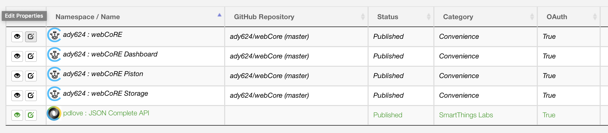 그러면 위의 이미지들처럼 4개의 웹코어 스마트앱스가 설치되는데, 이중에 가장 위에있는 ady624 : webCoRE 왼쪽에 있는 edit을 선택한 후 OAuth를 enable 해주고 업데이트 해준 후 publish for me를 실행해줍니다.