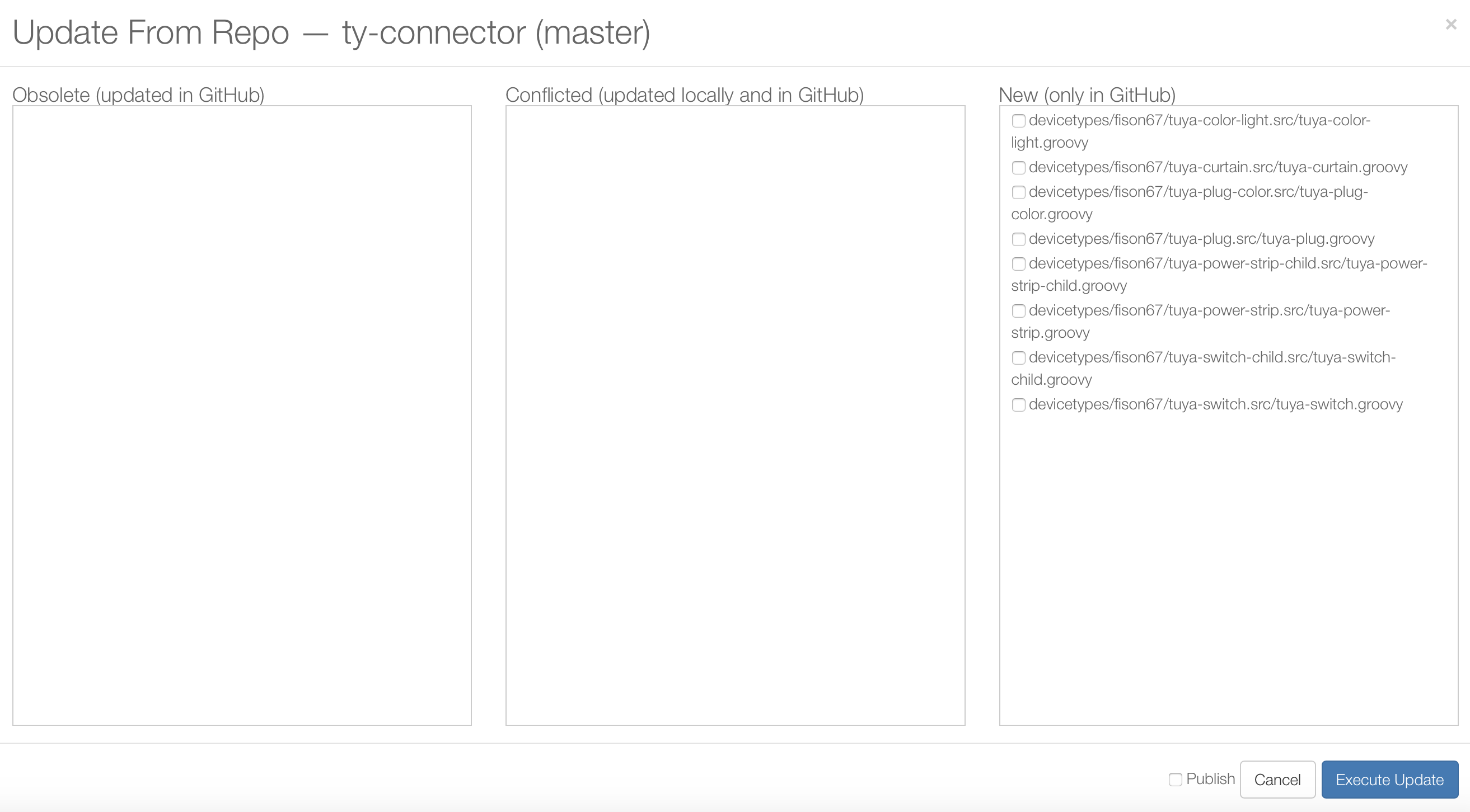 DTH를 설치하면 투야커넥터에서 지원하는 기기들을 볼 수 있습니다. 사용할 기기들을 체크하고 아래에 퍼블리쉬 클릭 후 업데이트 해줍니다. 사용하지 않을 제품들은 굳이 추가하지 않아도 됩니다.