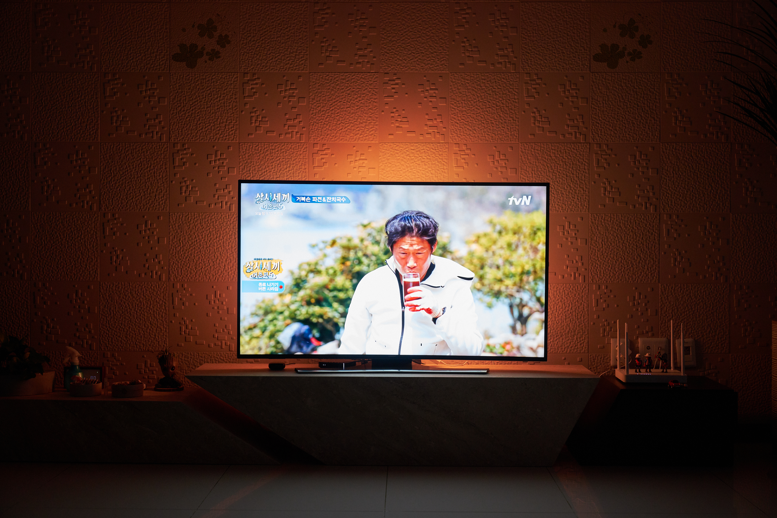 이 날은 삼시세끼를 하는 날이었습니다. 아이들을 다 재워놓고 맥주 한 잔에 여유롭게 텔레비전을 보니.. 기분도 힐링되고 참 좋습니다. 어두운 곳에서 텔레비전이나 모니터를 오래 봤던 분들이라면 이렇게 무드등을 설치해보는 것을 추천드리고 싶습니다. TV화면 밝기 때문에 눈이 불편할 때가 있는데.. 이렇게 무드등처럼 설치해놓으면 눈이 엄청 편해집니다. 저는 주황색이 편해서 그렇게 세팅을 해봤습니다.