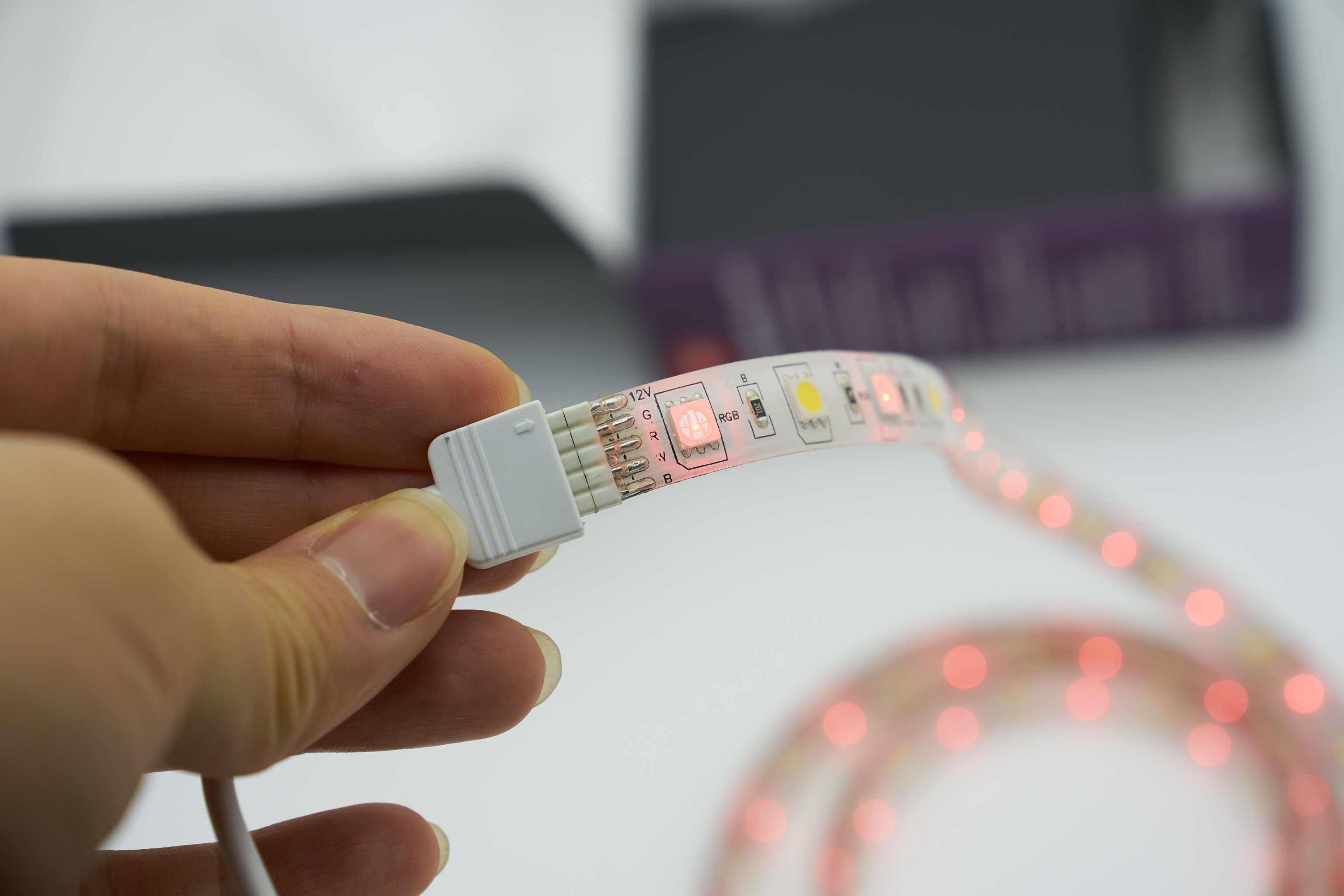 컨트롤러와 LED스트립은 이렇게 연결해주면 됩니다. 연결하고 전원을 켜주면 LED에서 불이 들어옵니다. 헤이홈의 조명들은 동일한 방법으로 세팅하는데, 처음 전원을 연결했을 때 전등이 깜빡이는 것이 페어링 준비가 되었다는 의미입니다. 이 상태에서 헤이홈 애플리케이션으로 연결해주면 되는데, 이 제품은 2.4G 와이파이를 사용합니다.