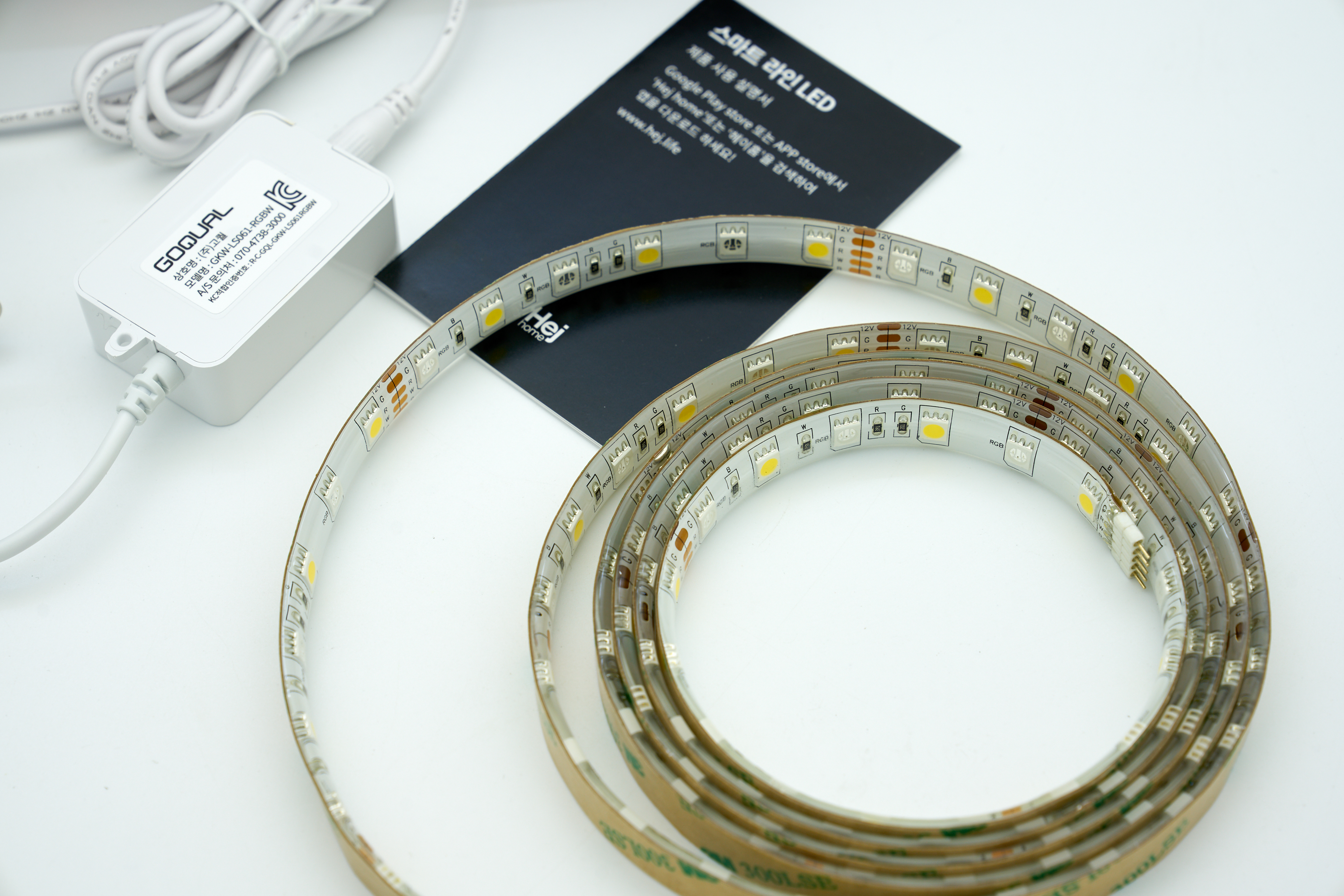 구성품은 LED 스트립과 전원 어댑터와 컨트롤러가 포함돼있습니다. 컨트롤러와 어댑터는 헤이홈 홈페이지에서 연장케이블을 따로 구입할 수 있어요. 이게 일반 가구나 모니터 TV에 설치할 때는 큰 상관이 없지만 커튼박스에 설치할 때는 길이가 살짝 애매한 면이 있습니다. 저는 커튼박스에 콘센트만드는 작업을 계획하고 있는데, 그렇지 않은 분들은 연장선을 고민해보셔도 될 것 같아요.