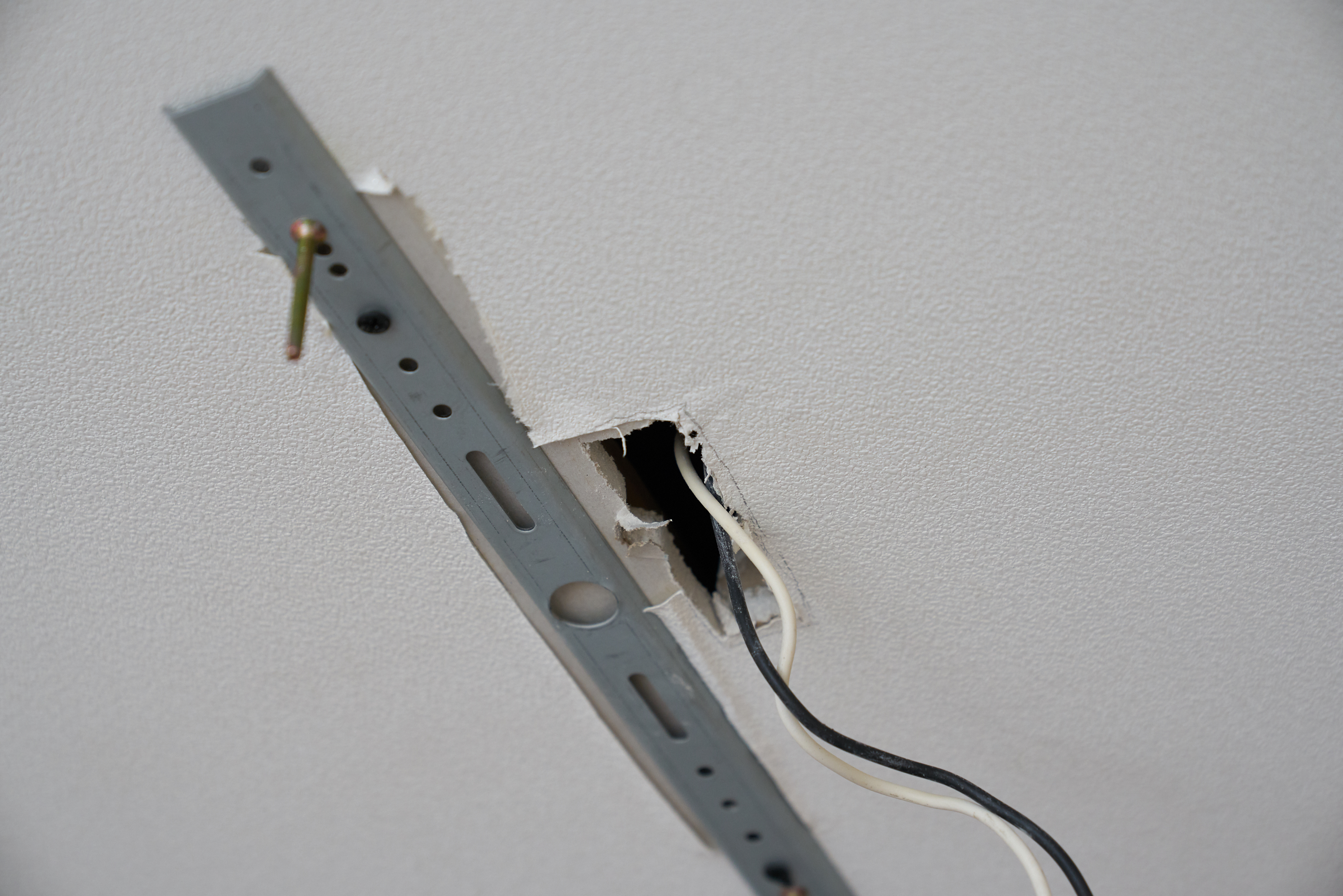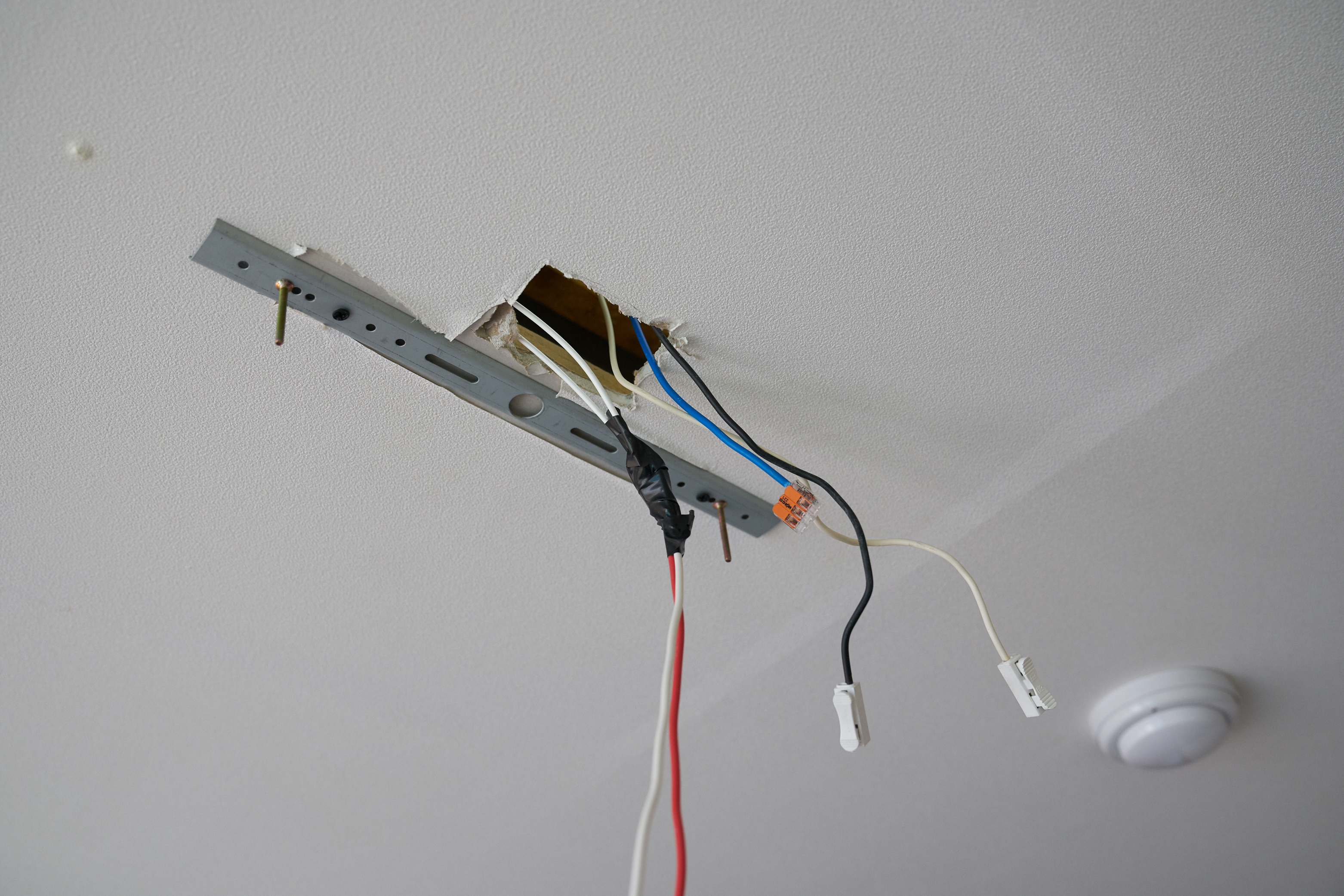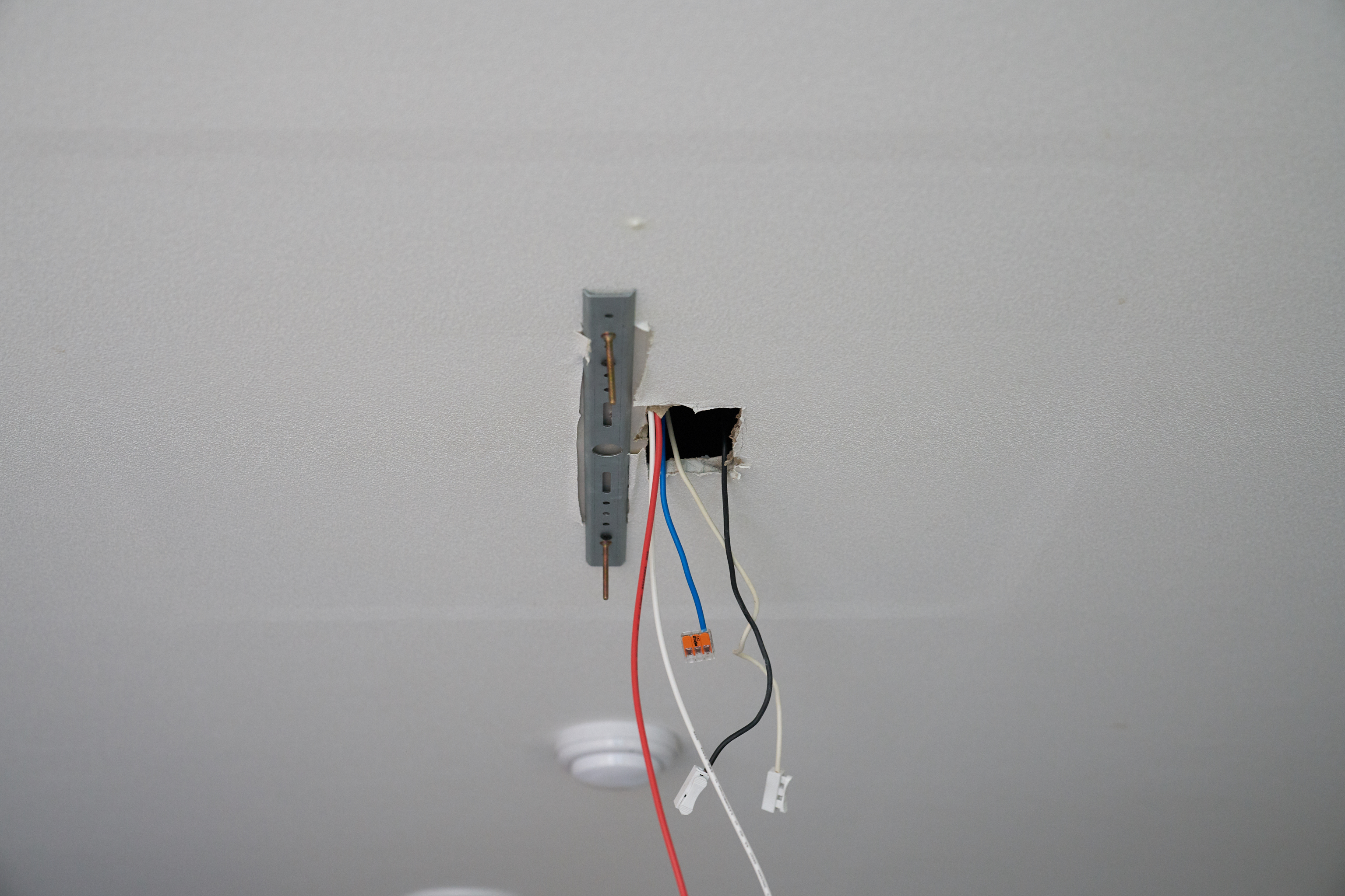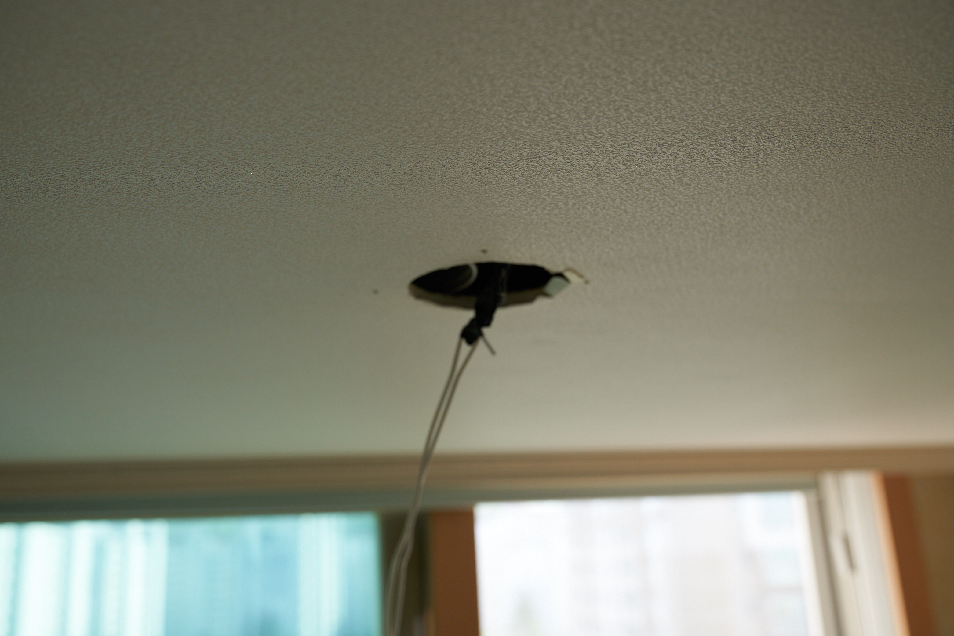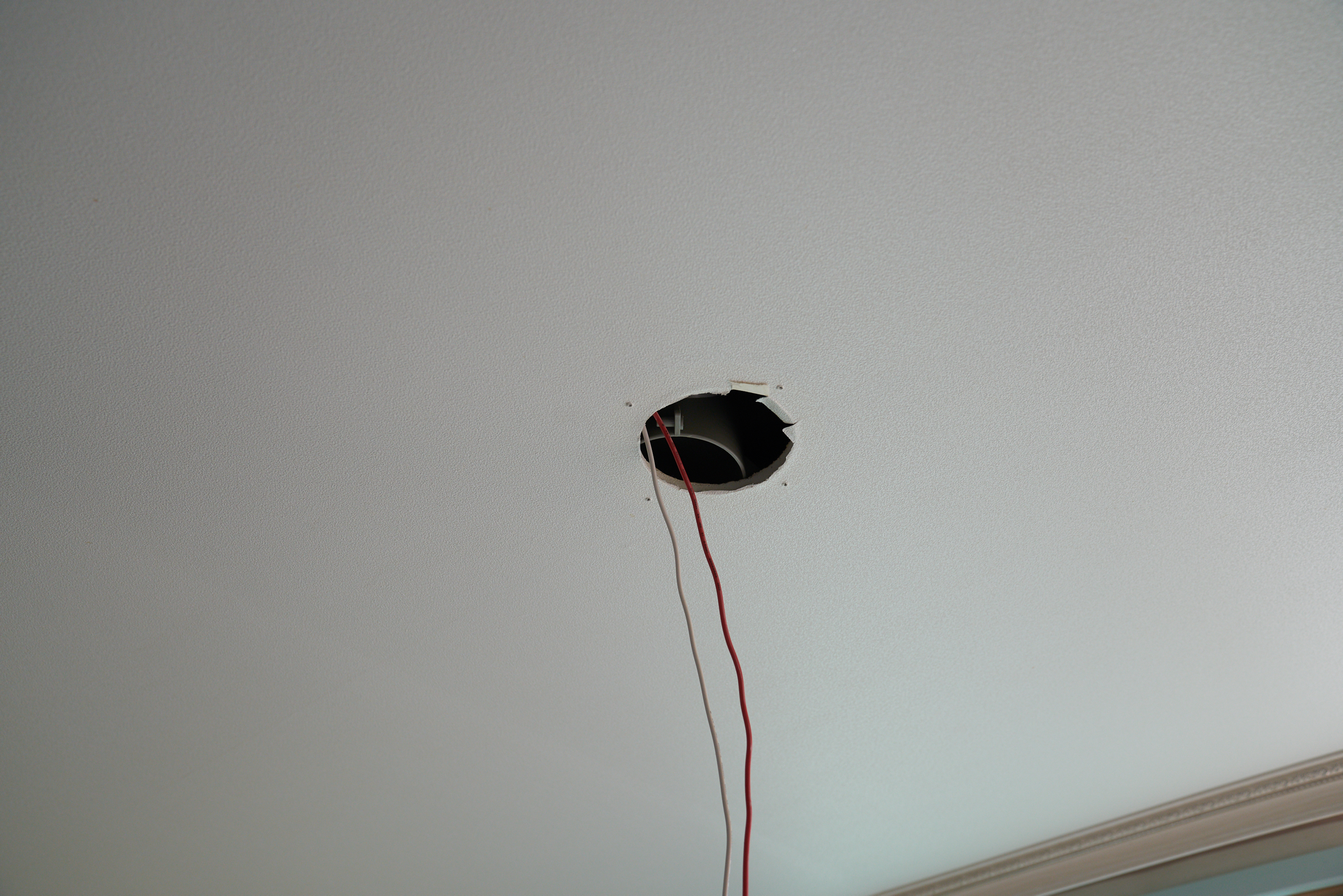 그래서 전등을 철거하고 구멍을 살짝 만들어줬습니다. 일단 구멍 사이즈는 손이 하나 들어갈 수 있을 정도만 만들어줬습니다. 왜냐.. 나중에 무슨 일이 생길지도 모르고.. 다음에 이사오게 될 사람이 전등을 교체하더라도 문제가 생기지 않도록.. 최대한 작게 만들어줬습니다..만..