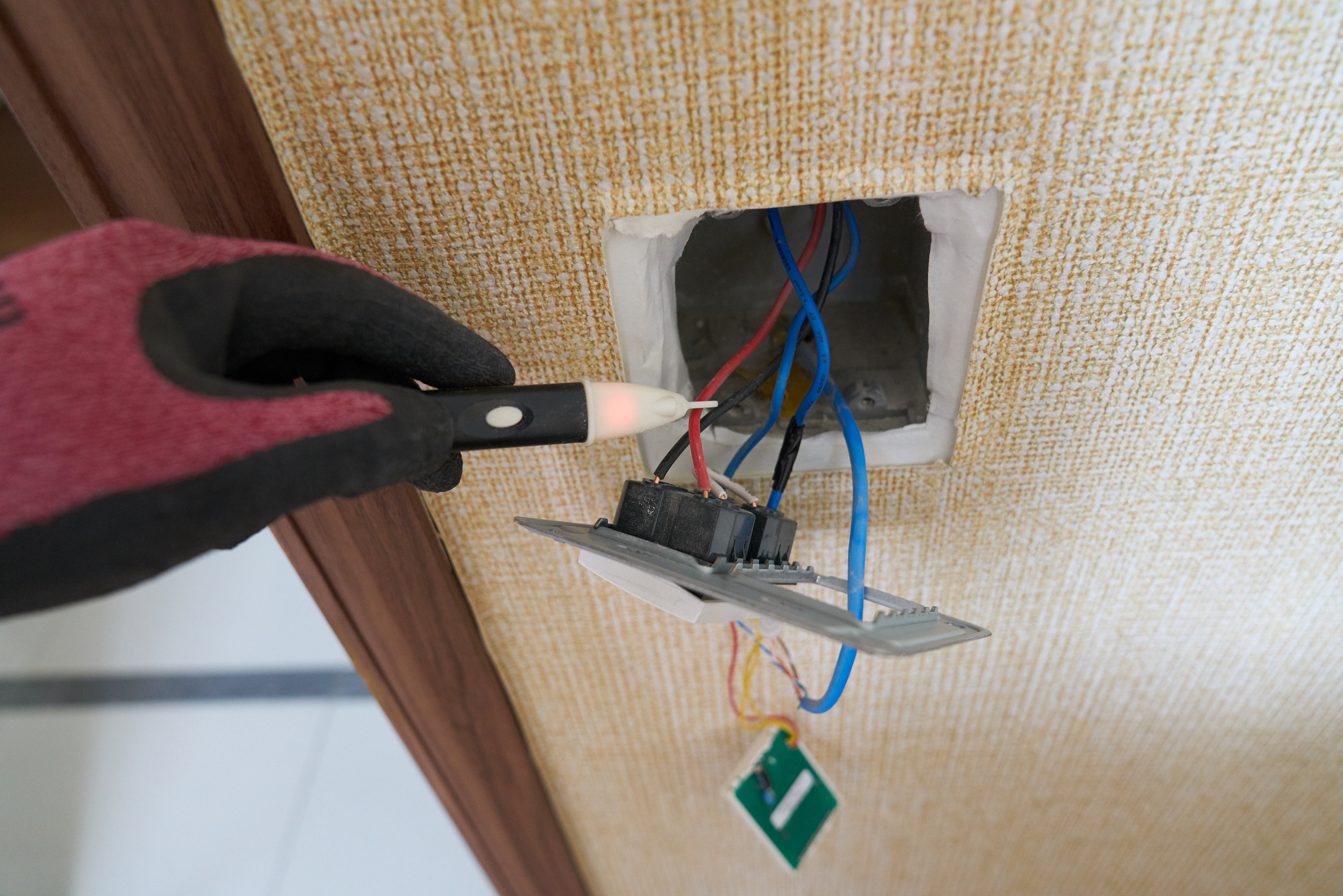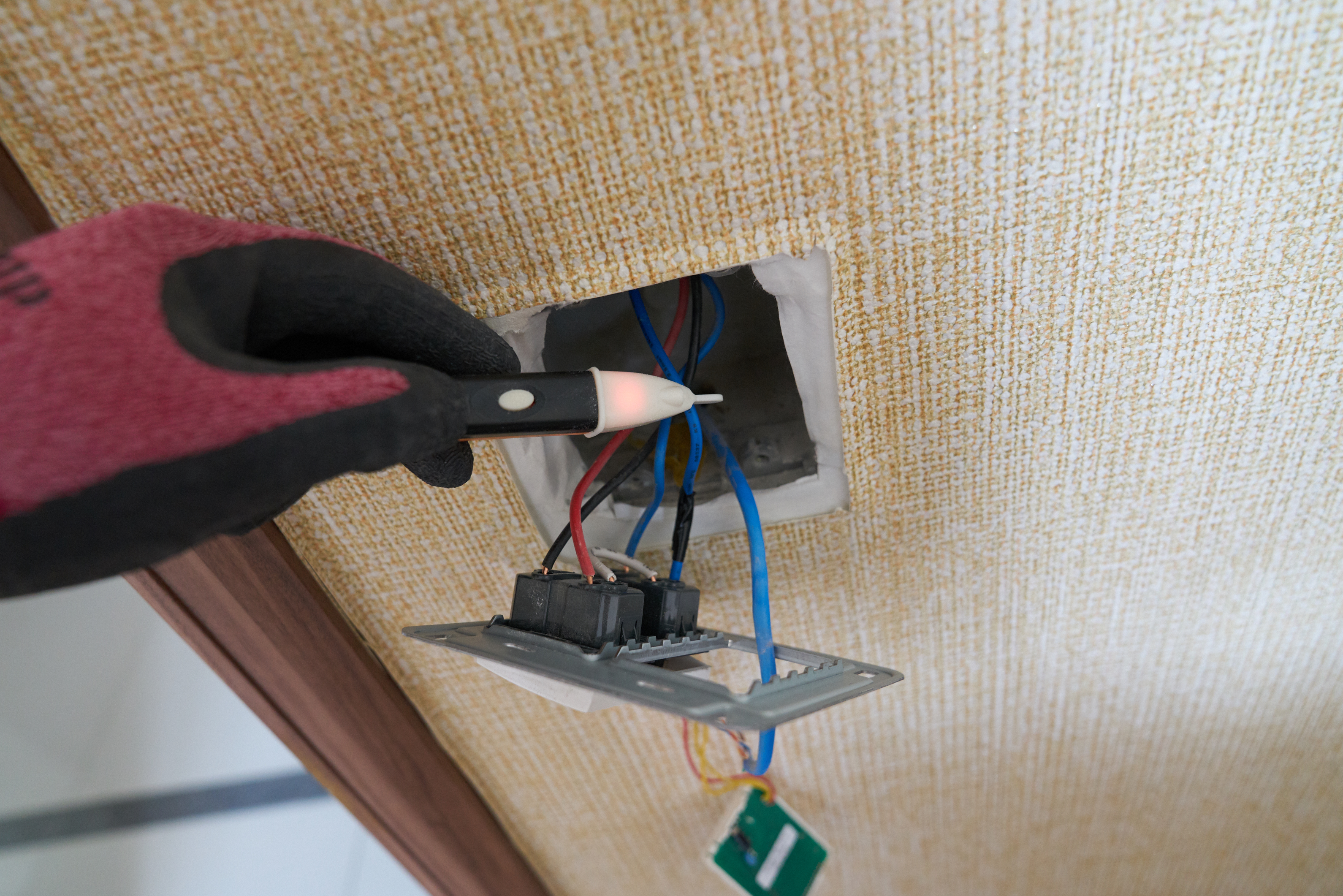 천장 전등 부분에서 나머지 전선들을 연결해줬습니다. 전선을 연결해준 후에는 상선이 잘 흐르는지~~ 검전기로 확인 해줬고요.