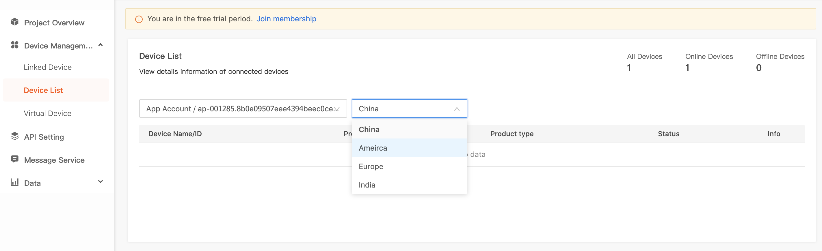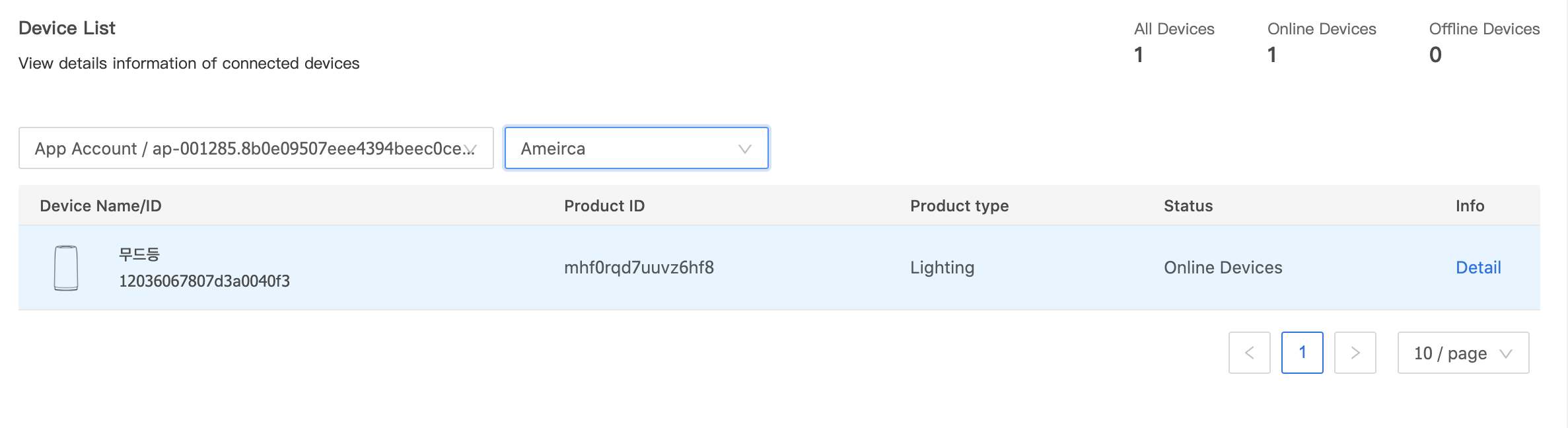 Device List에서 국개를 아메리카로 변경해주면 투애 애플리케이션에 페이링된 디바이스 리스트를 볼 수 있습니다.