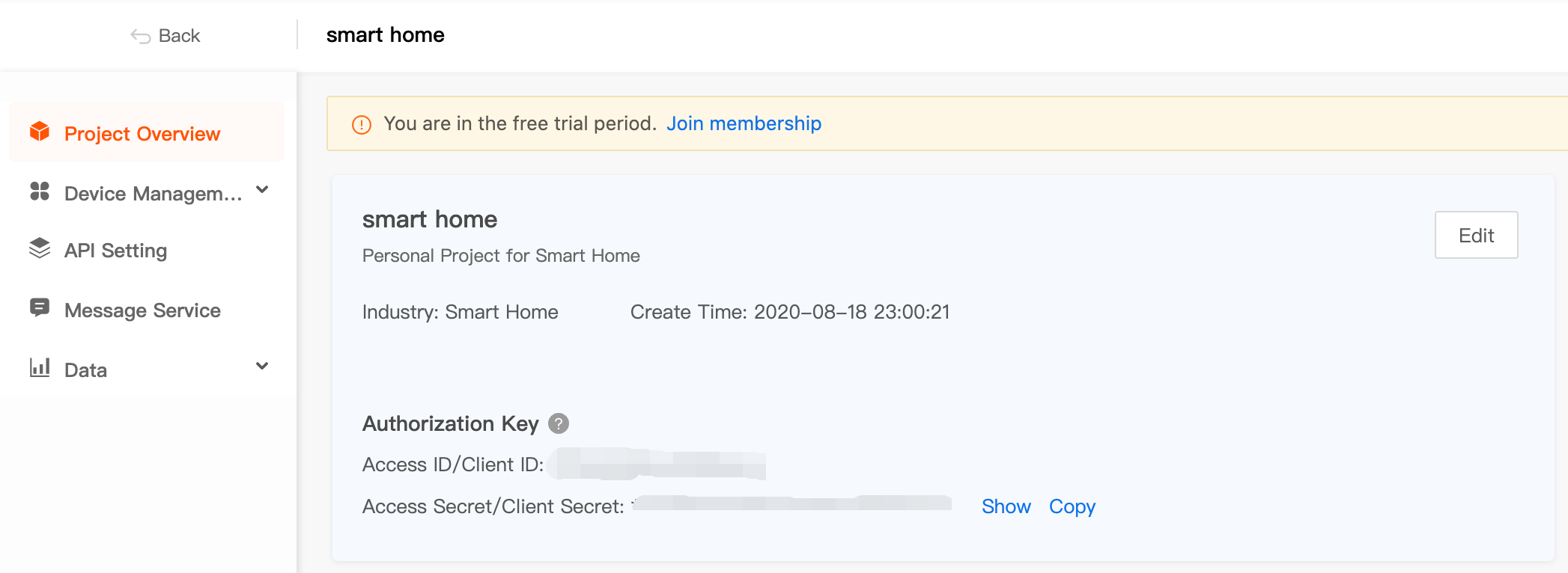 왼쪽 메뉴에서 Project Overview를 살펴보면 api key와 api secret key를 볼 수 있습니다.