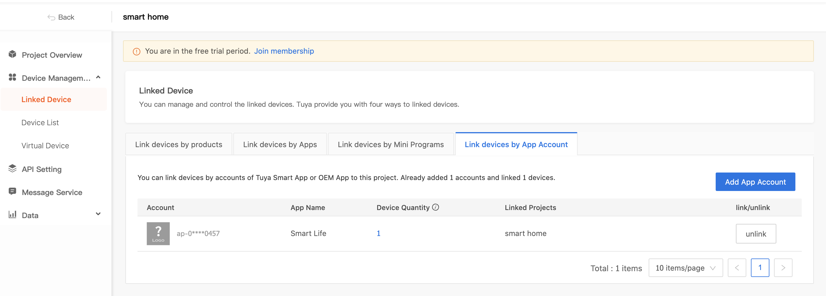Create 해준 후 Cloud Developmet - Linked Device - Link Device by App Accout에 들어가서 Add App Acount를 클릭해주면 QR코드가 하나 나오는데, 스마트라이프 앱으로 QR코드를 스캔해주면 로그인 하겠냐는 화면이 나오고, 로그인을 눌러주면