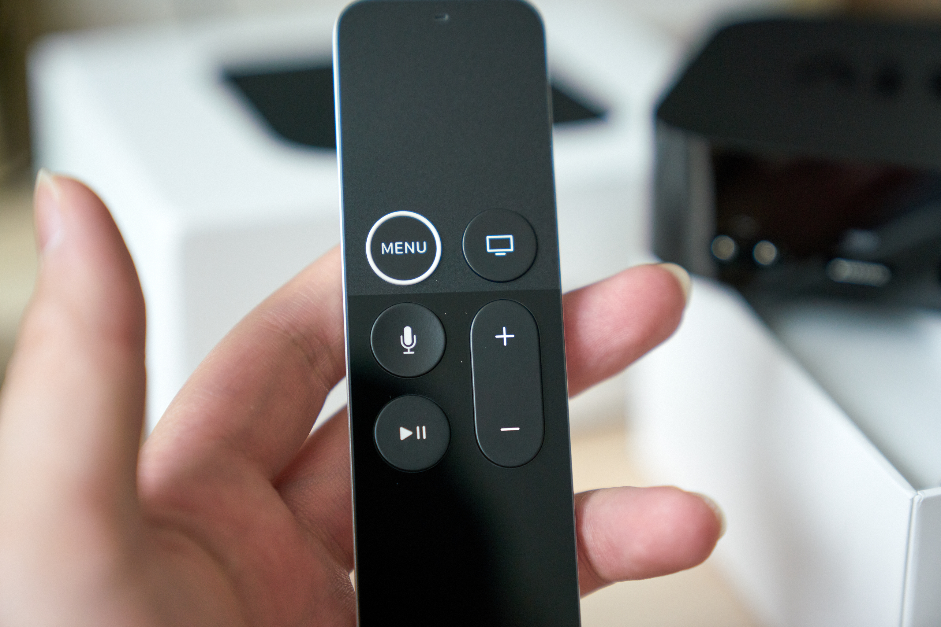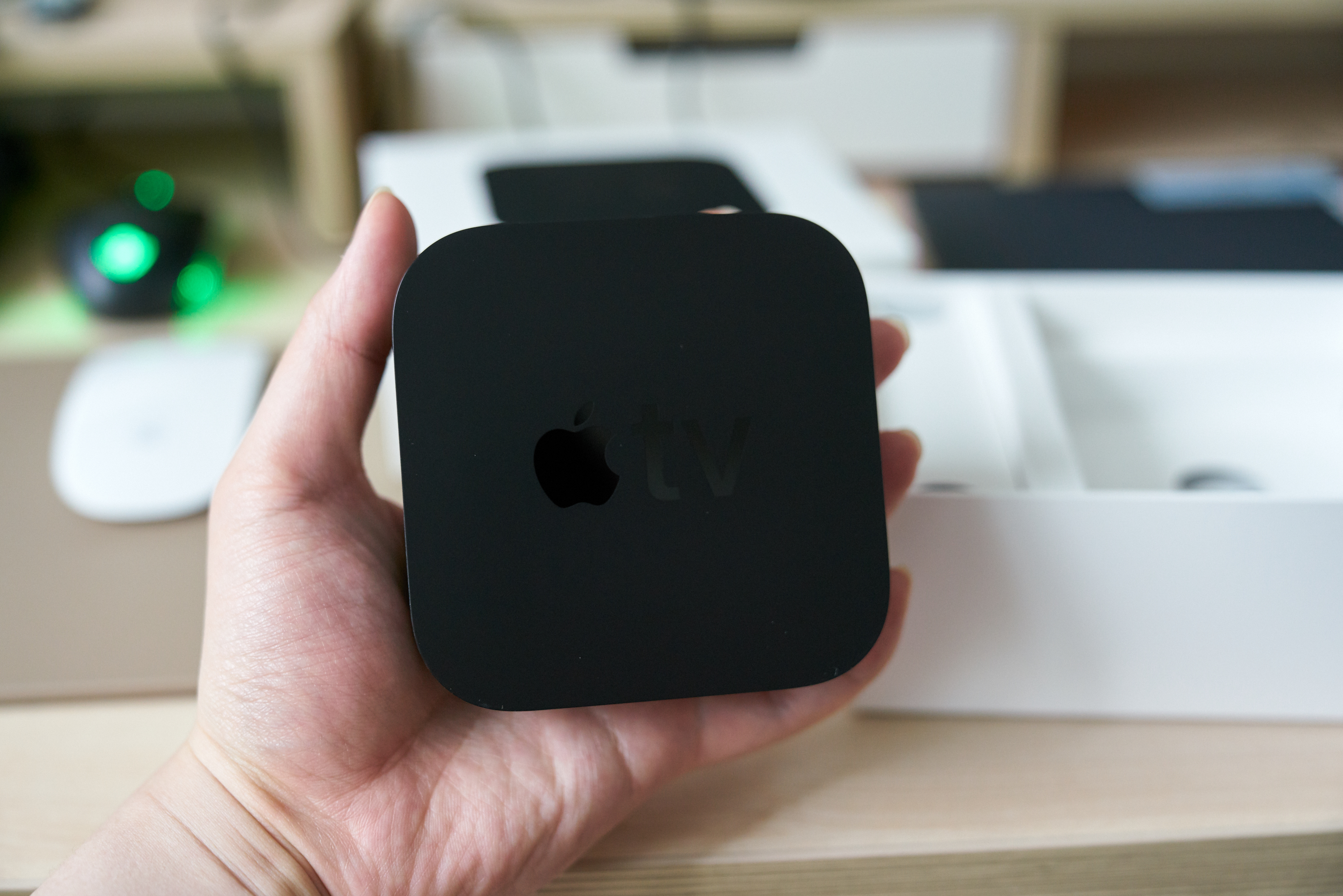 일단 살짝 개봉부터 해보자면.. 애플답지 않게 검정색의 작은 셋탑박스가 보입니다. 그리고 성인의 손바닥에 척! 하니 올라갈 크기의 리모컨이 제공됩니다.