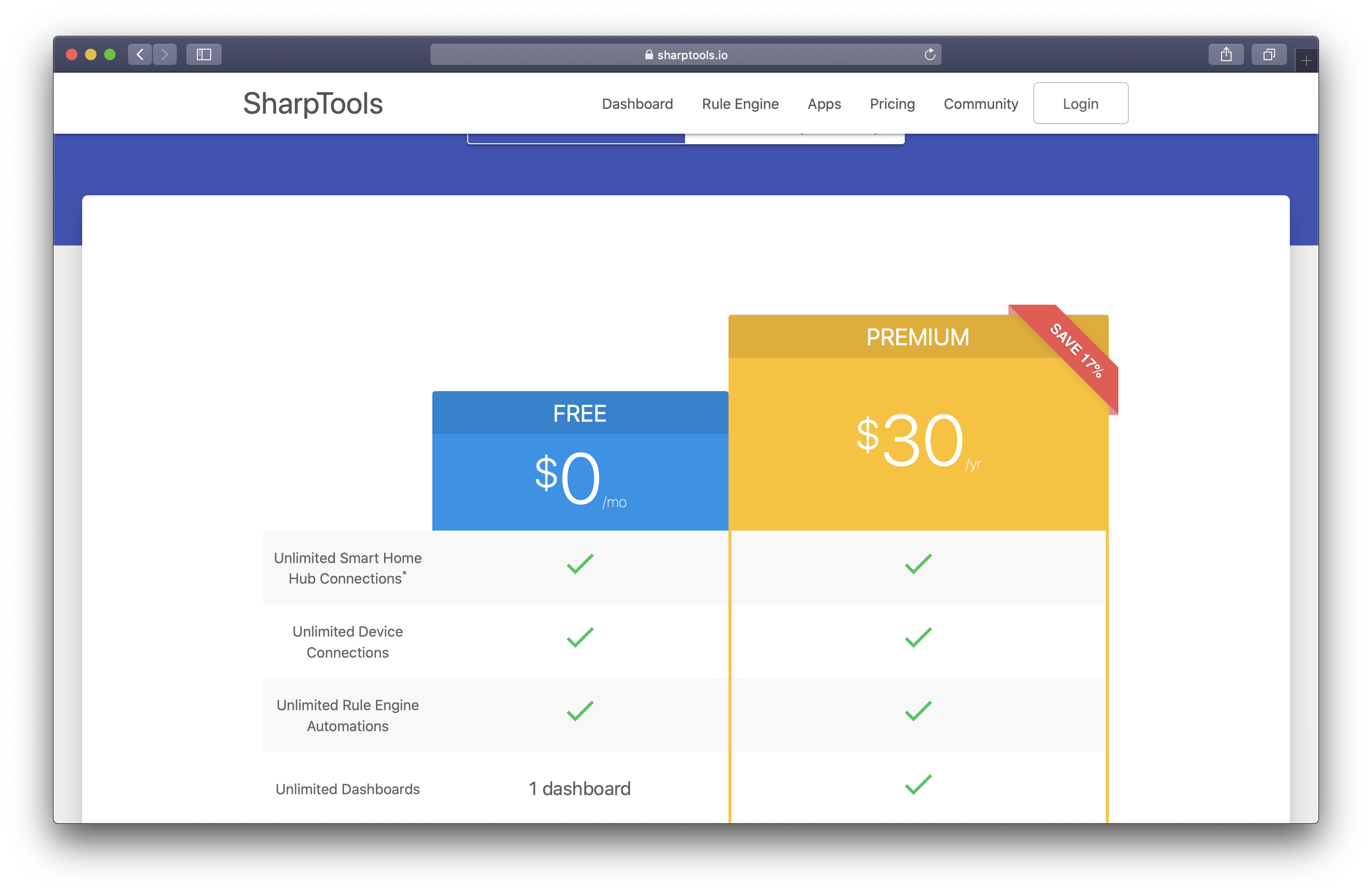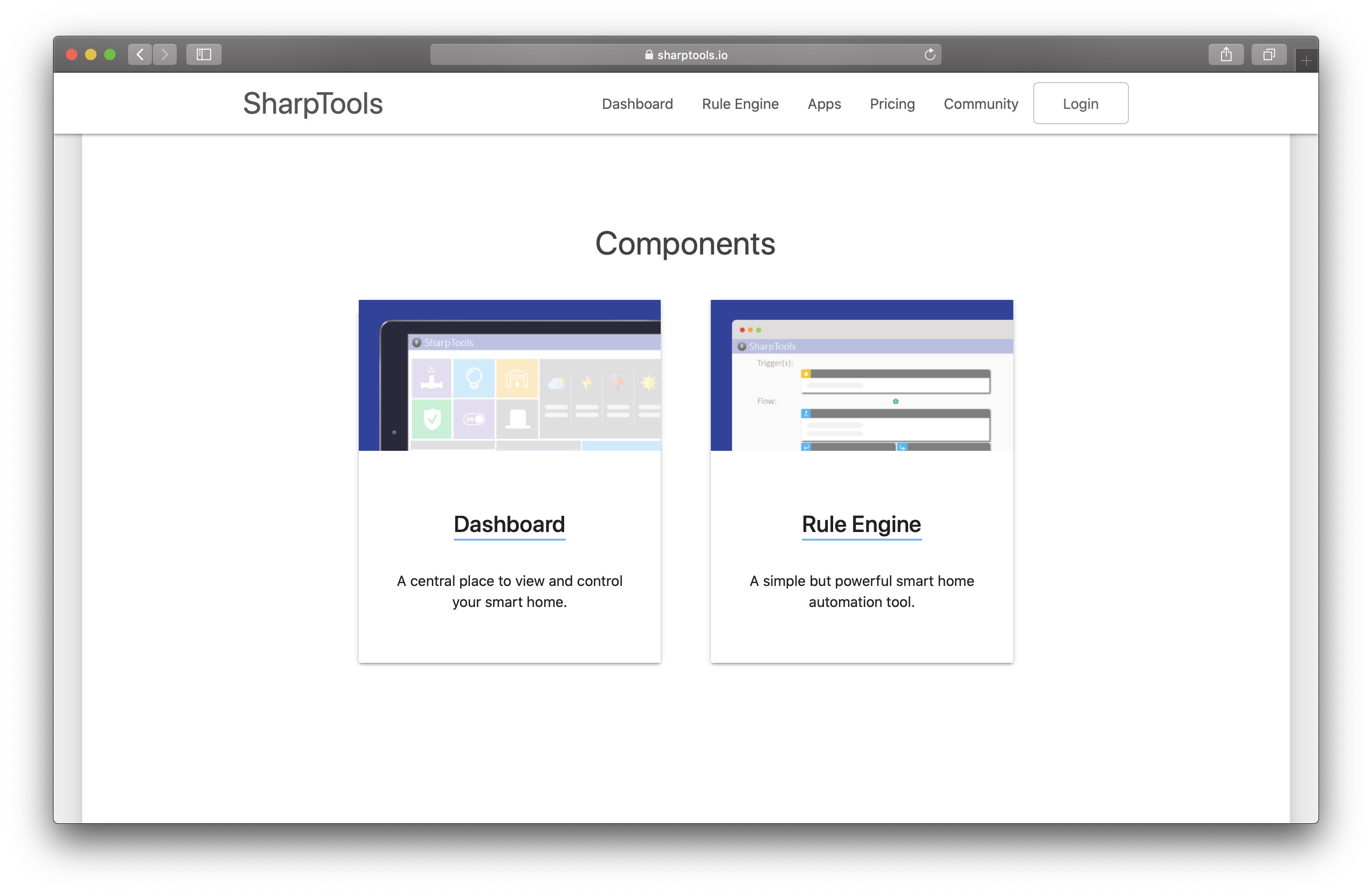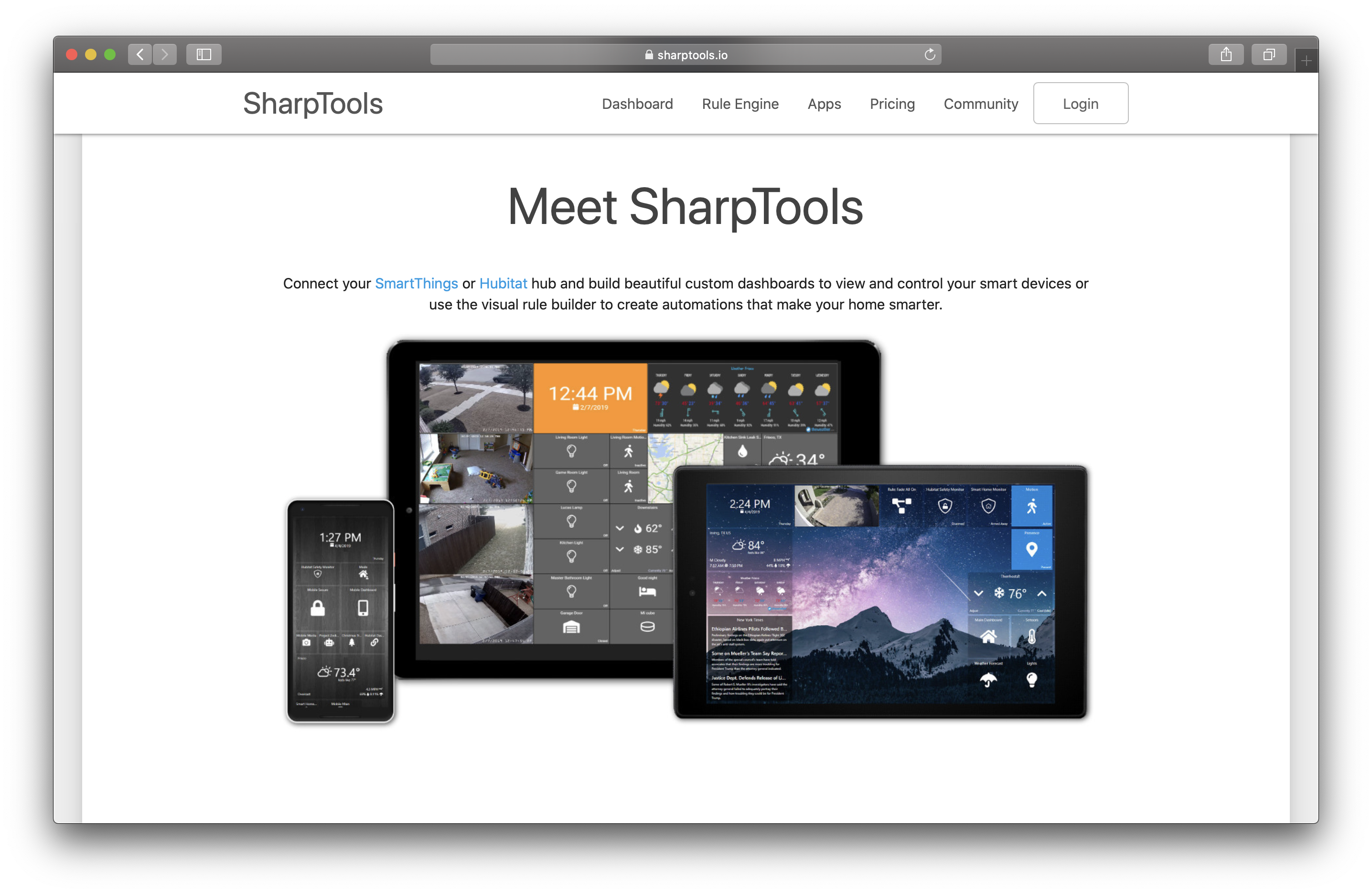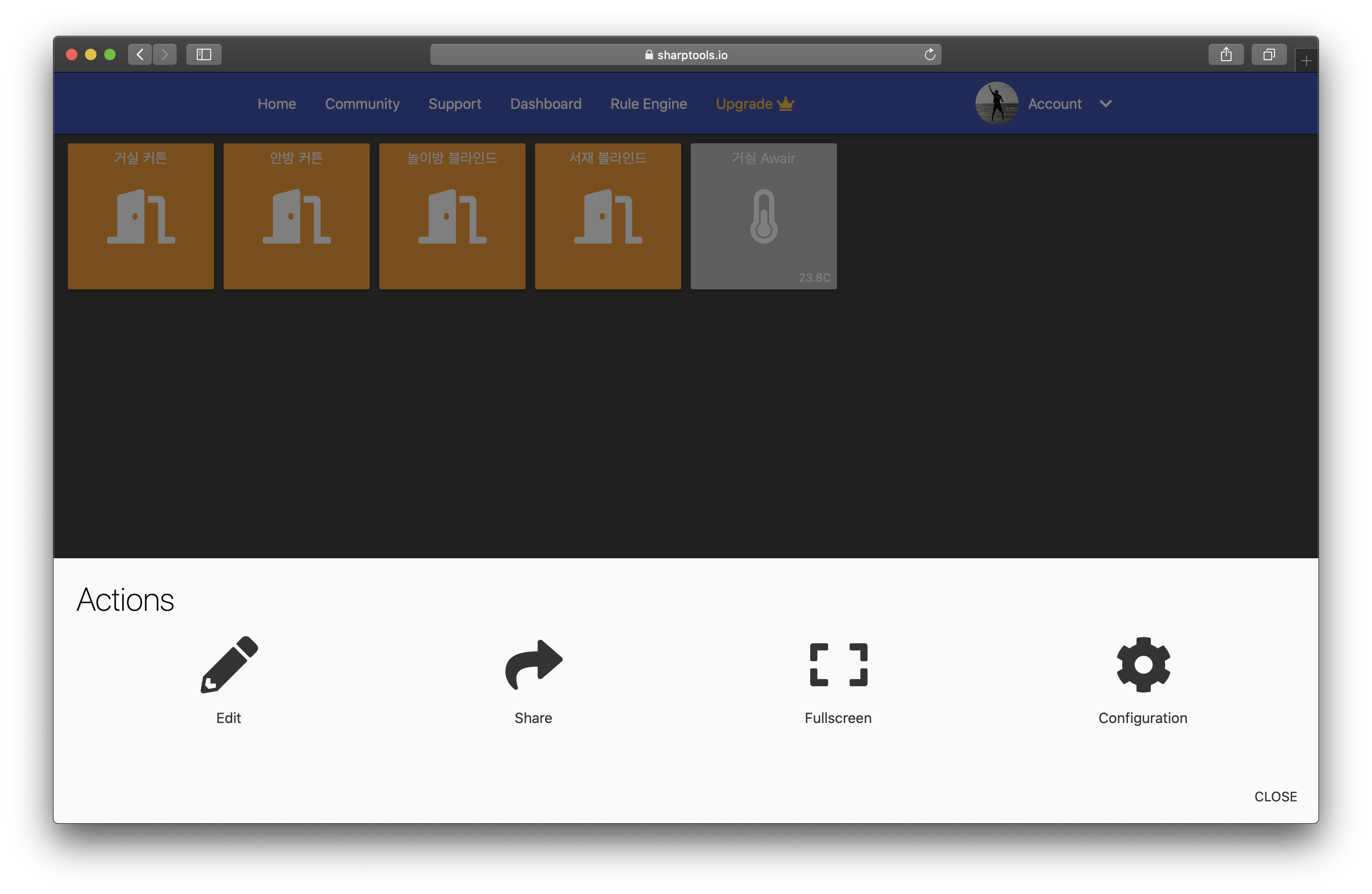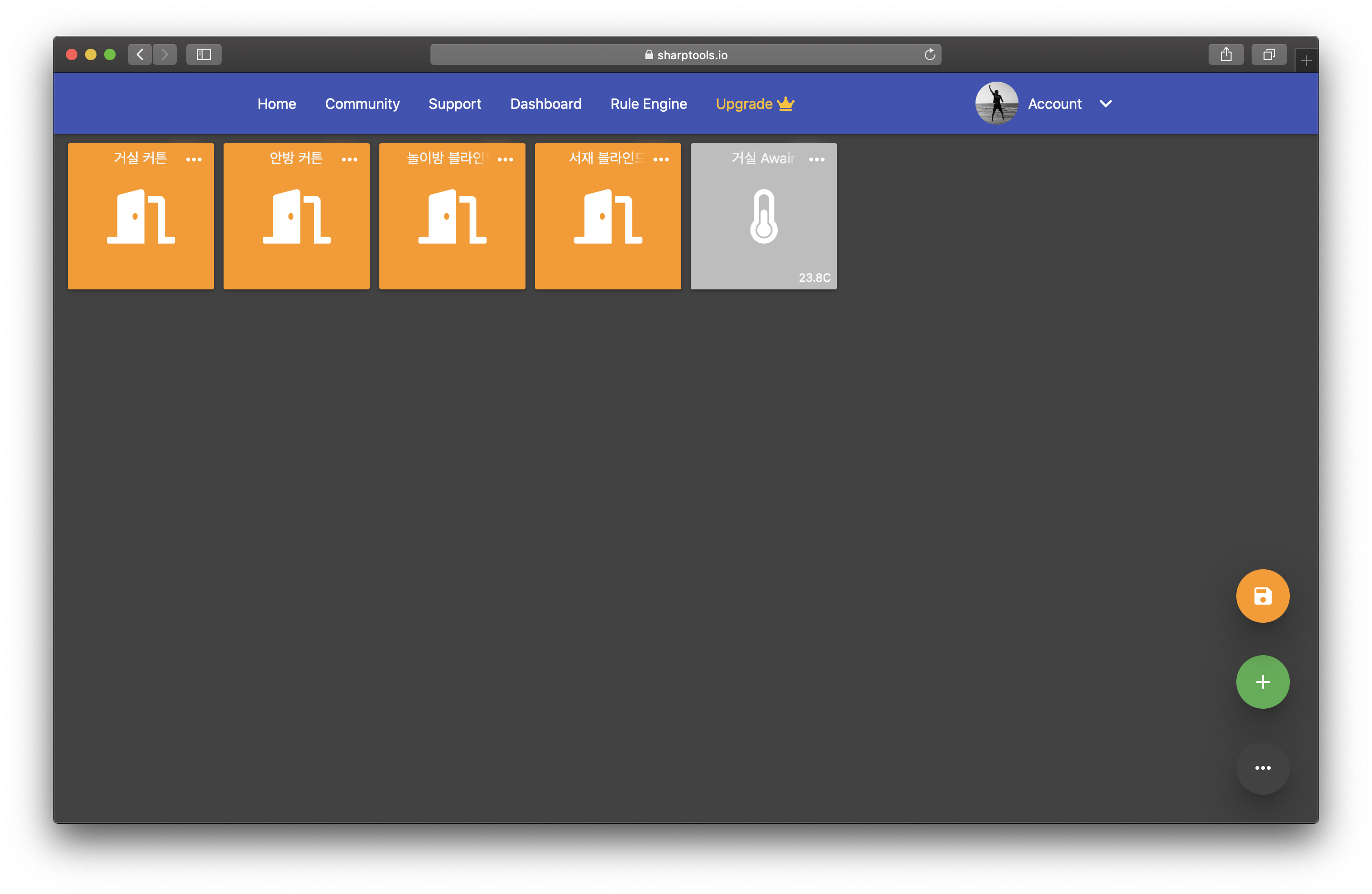 샤프툴에서는 기본적으로 대시보드와 룰엔진 기능을 제공하고 있습니다. 대시보드는 말 그대로 기기들을 제어하는 버튼 그리고 날씨나 웹브라우저 등등 개인이 꾸밀 수 있는 공간이고, 룰엔진은 자동화 부분인 것 같습니다. 스마트싱스 허브에서 자동화 구성을 할 수 있지만 간단한 자동화는 샤프툴에서도 가능해보입니다.