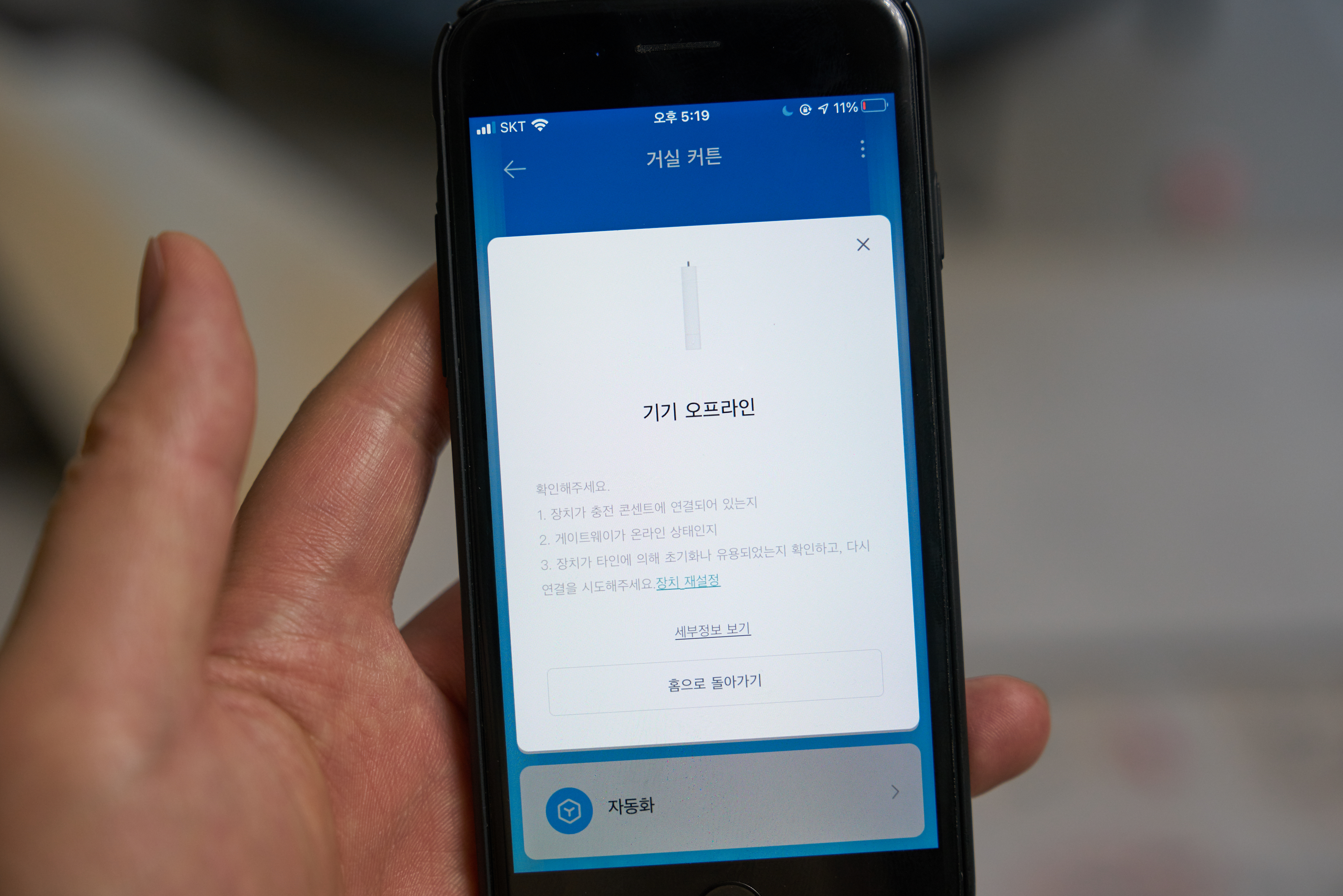 기기 초기화해 재연결은 커튼모터 열고 닫는 버튼을 5초 동안 누르면 초기화되고 미홈에서 다시 연결해주면 됩니다.
