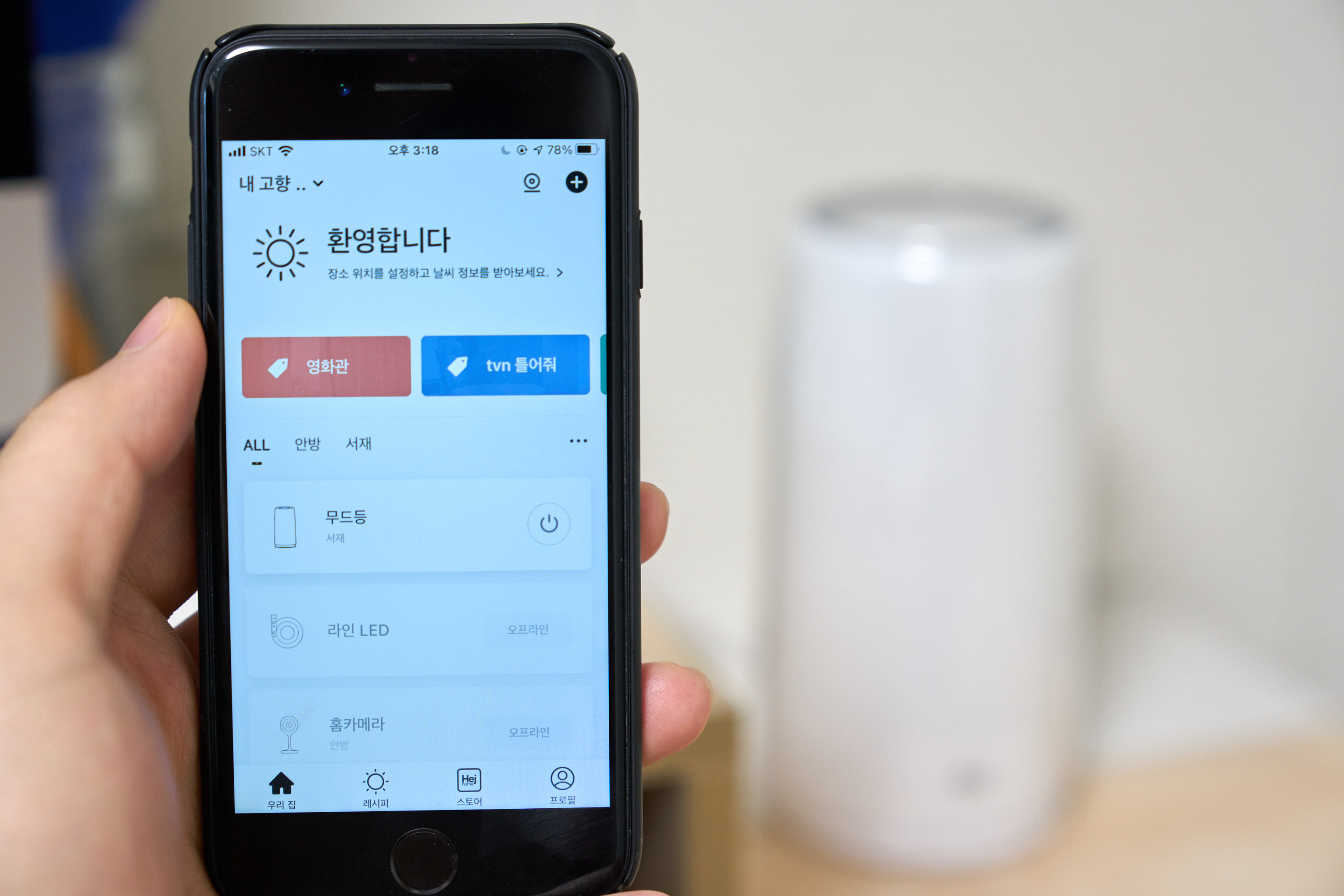 연동할 수 있는 제품들은 스위치나 센서 그리고 조명류가 가능한 것 같아요. 저는 조명류를 2개 가지고 있는데, 일단 전원이 꽂혀있는 무드등을 연동해볼게요.